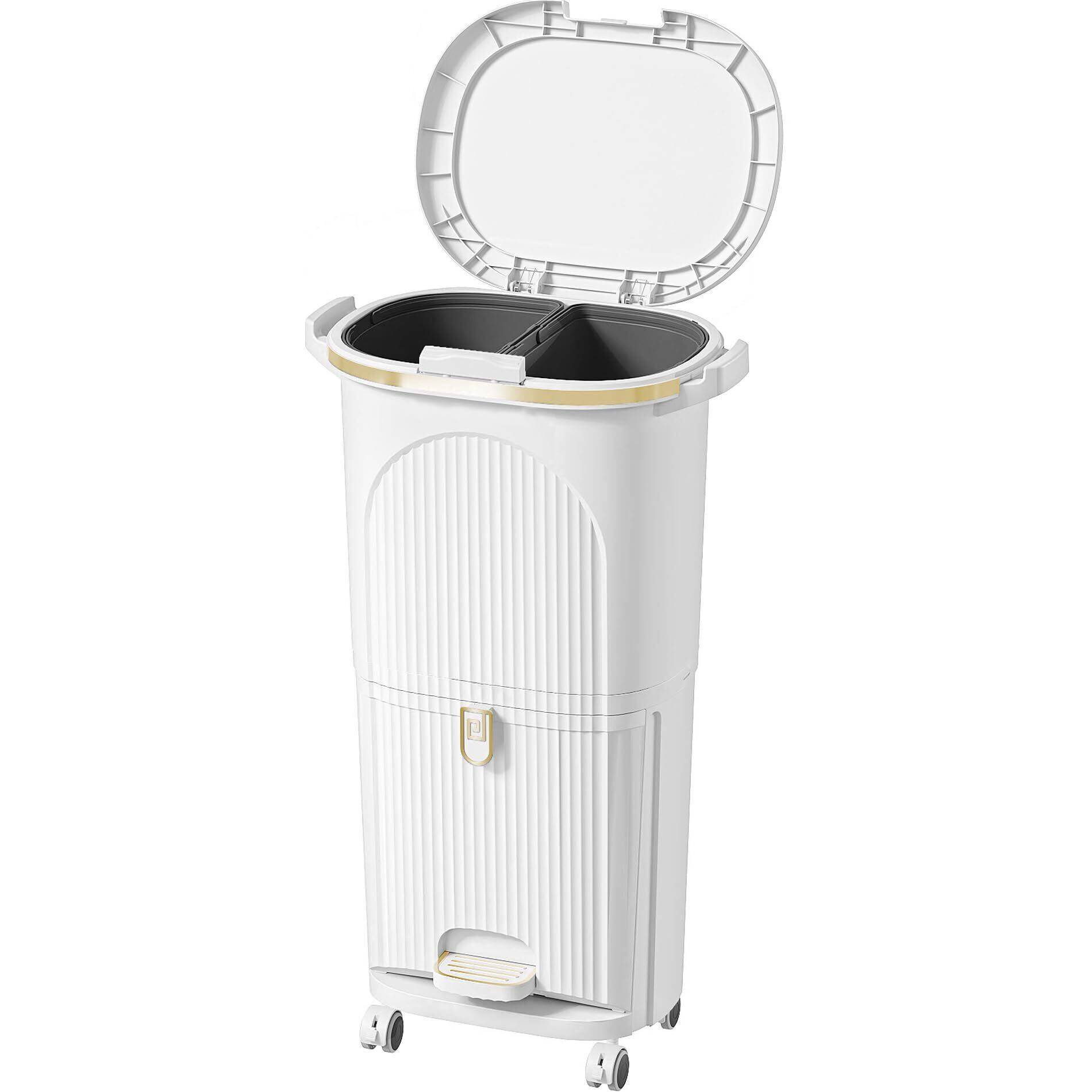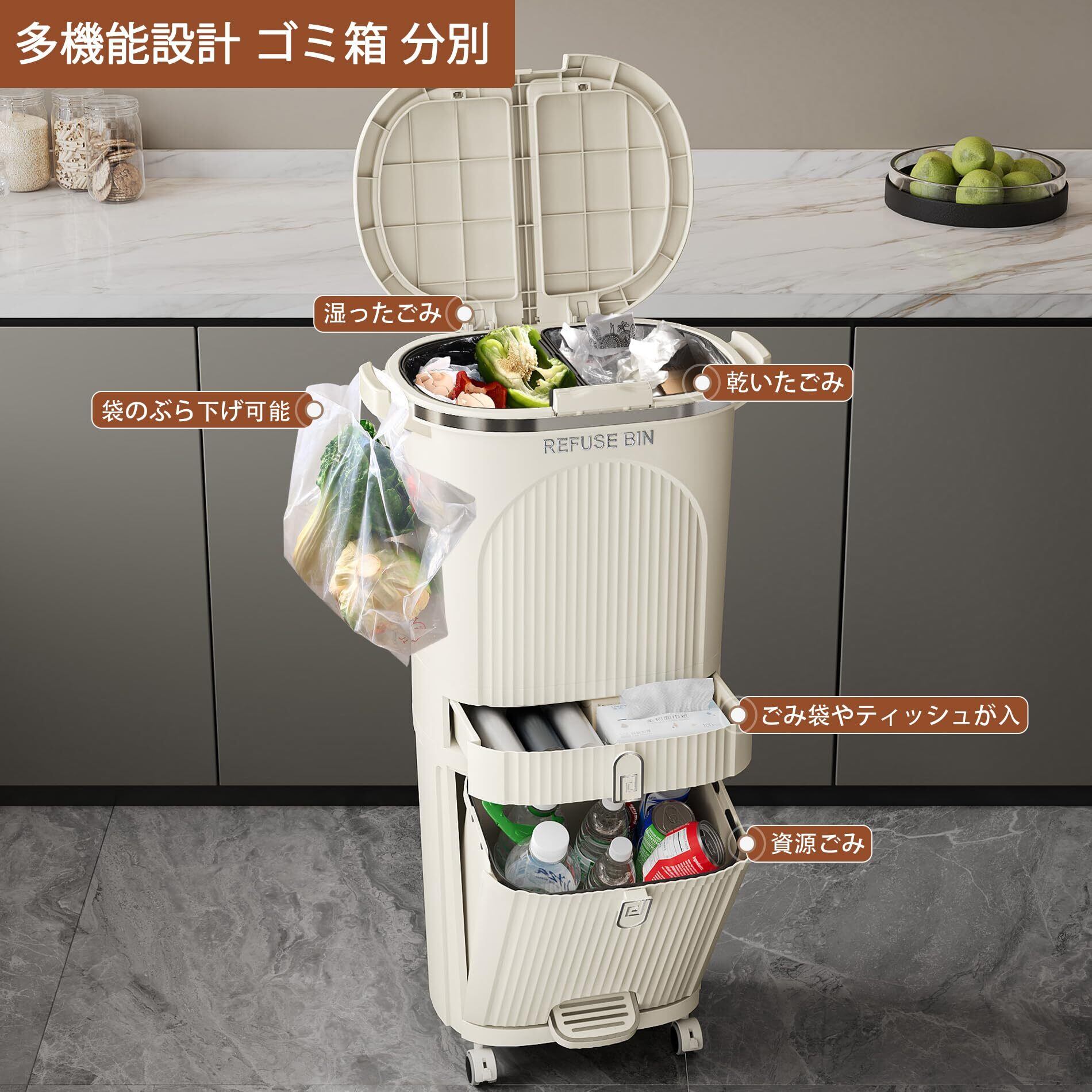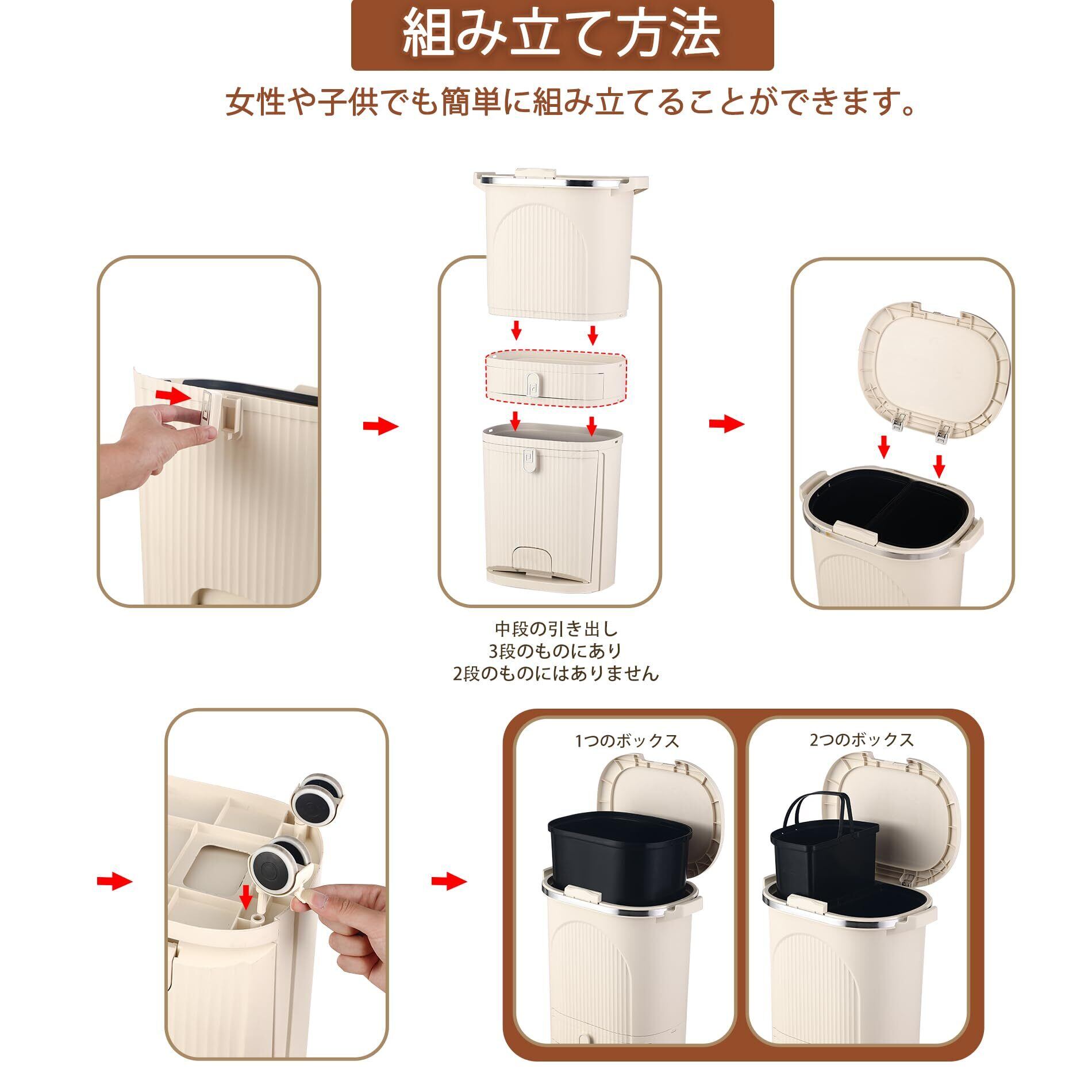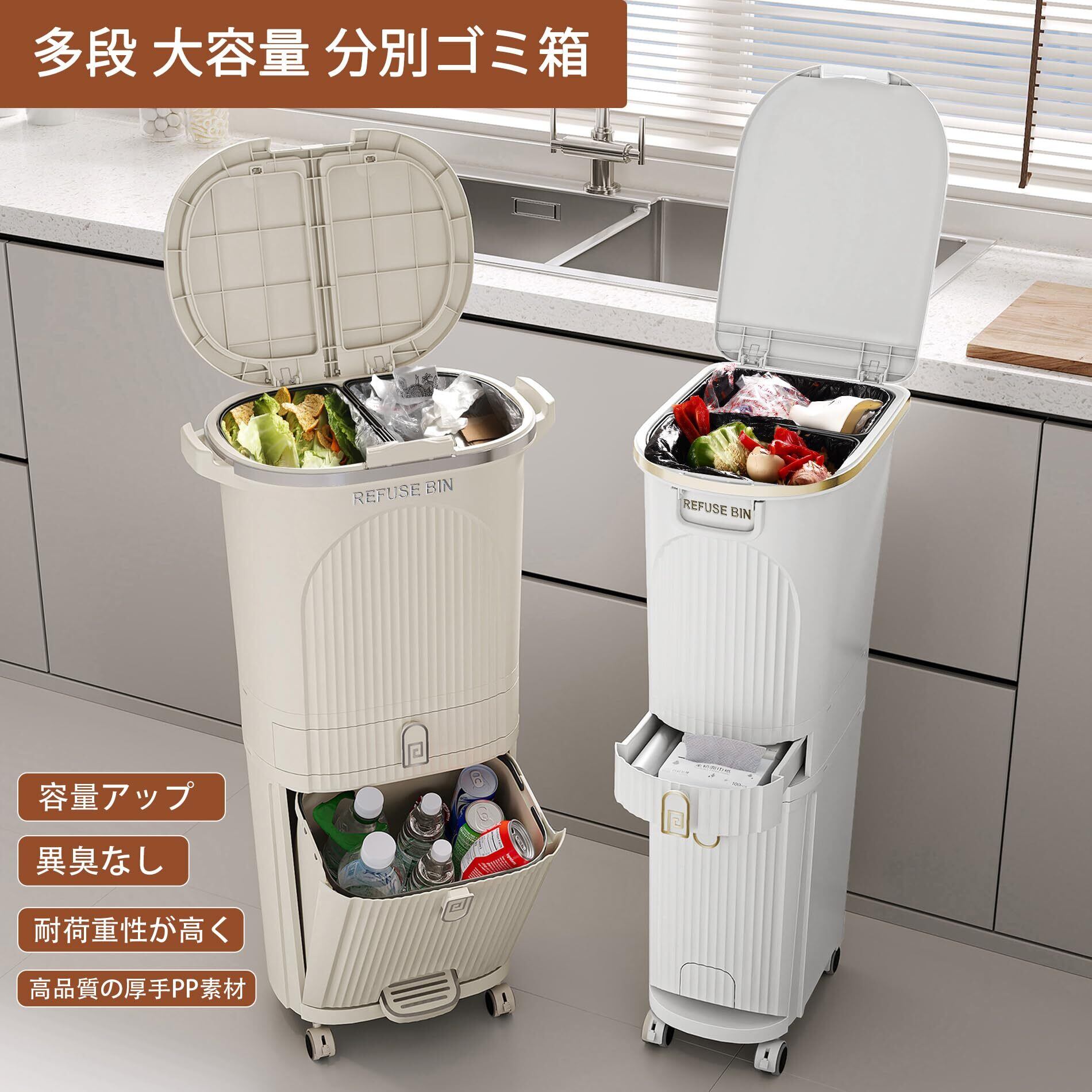 【実用的な設計&組み立て簡単】押しボタン式開閉で簡単に蓋の開け閉めができます。ペダルで簡単に下段のごみ箱を開けることができ、ペダルはしまうこともできるので、省スペースです。旋回式キャスターはゴミ箱を固定することも移動させることもできます。組み立て簡単、女性やお子様でも手軽に組み立てられます。