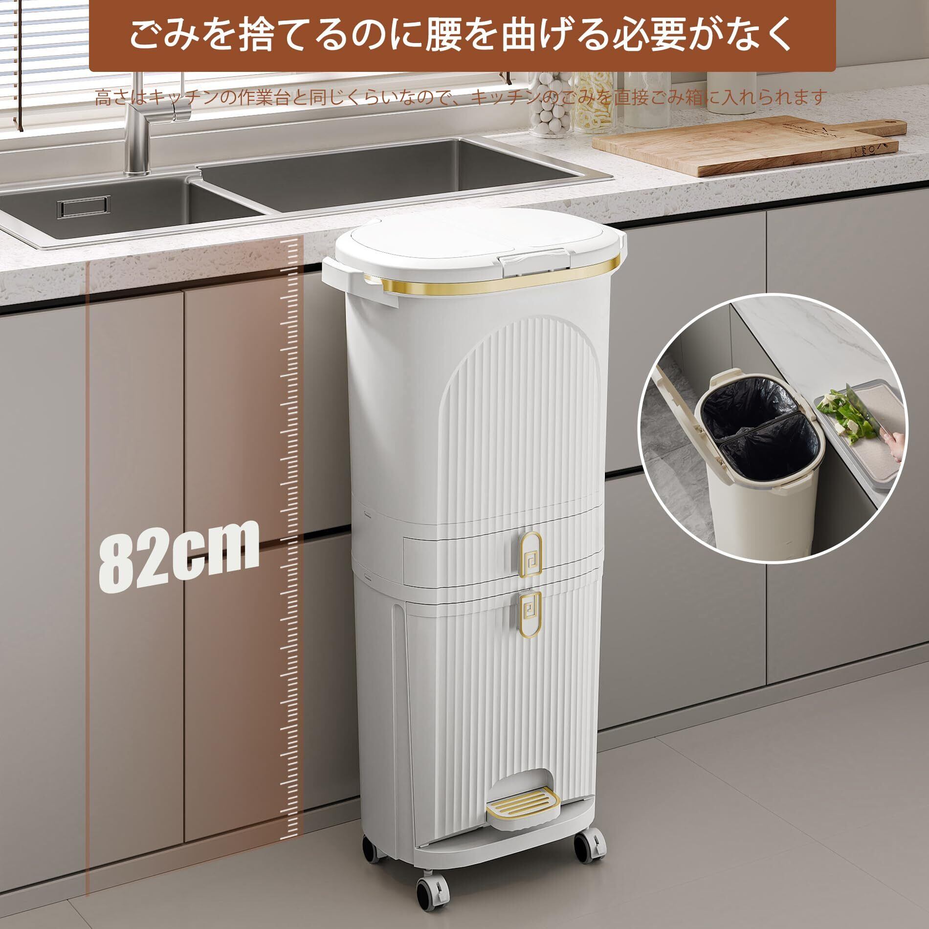 【ごみ捨てが楽に】ごみを捨てるのに腰を曲げる必要がなく、立ったままごみを入れられます。高さはキッチンの作業台と同じくらいなので、キッチンのごみを直接ごみ箱に入れられます。女性や高齢者には大助かりです。