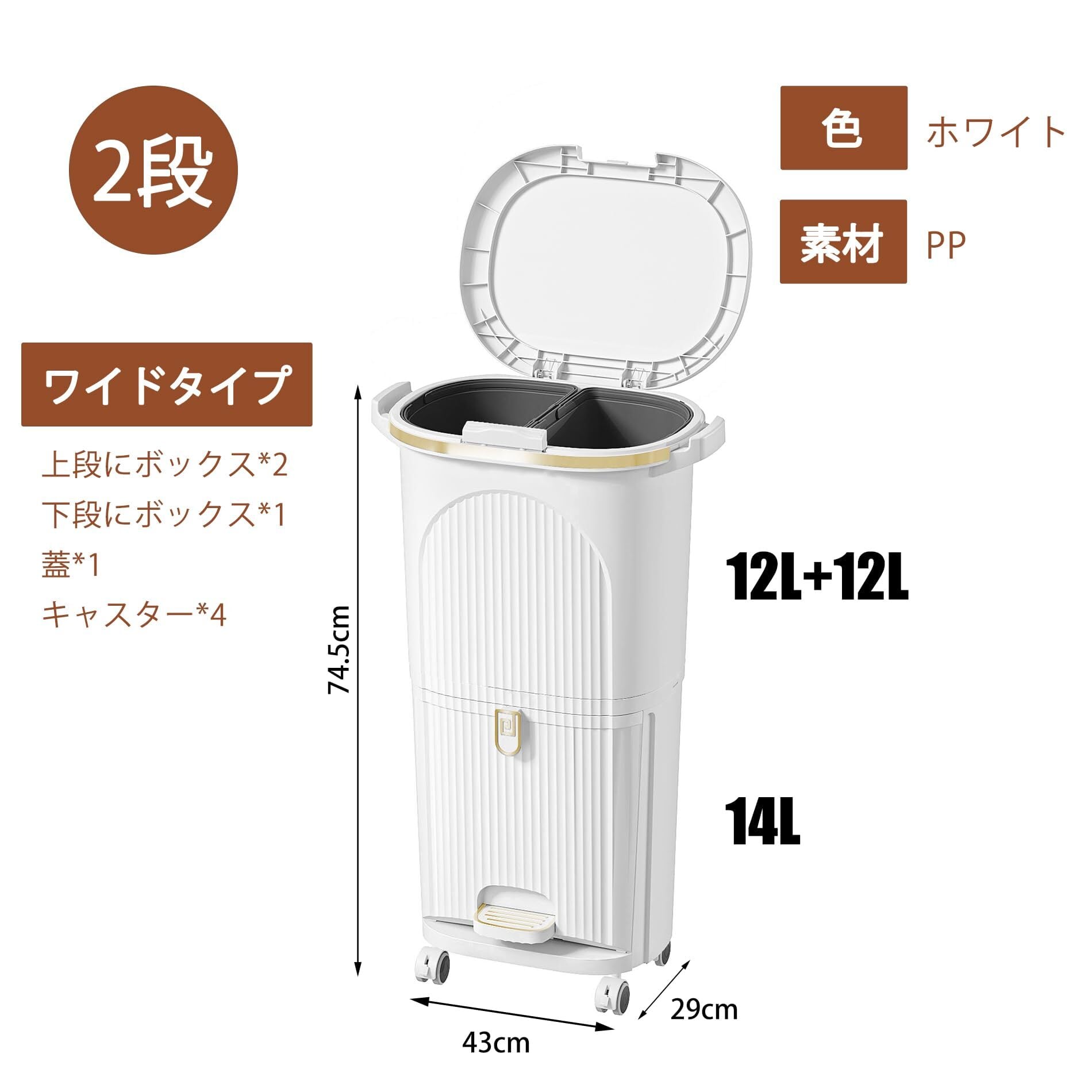 ゴミ箱 分別 2段 ふた付きゴミ箱 スリム ダストボックス おしゃれ キッチン 縦型 キャスター付き インナーバケット2つ 大容量 組立簡単 幅43x奥行29x高さ74.5cm 38L(12L+12L+14L) ホワイト