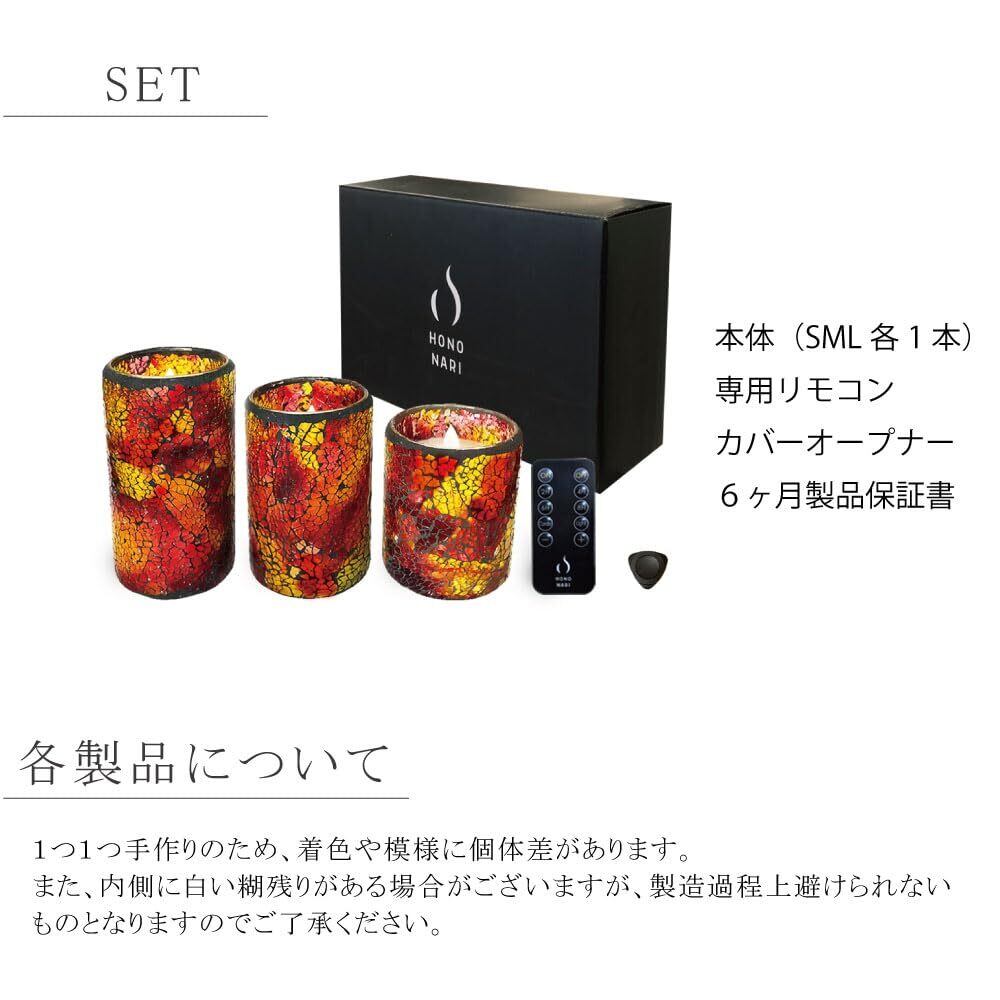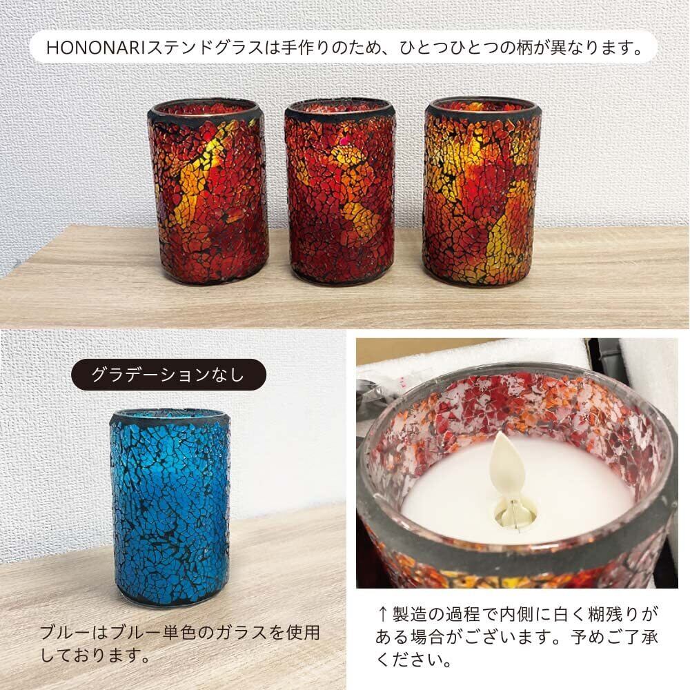 【便利なリモコン式】2・4・6・8時間のタイマー設定と5段階の明るさ調節がリモコン操作で可能です。 ※タイマーの設定方法は商品在中の取扱説明書をご確認ください。【HONONARIオリジナルなラインナップ】ご家庭のインテリアはもちろん、結婚式や飲食店などいろんなシチュエーションでお楽しみいただけるように、オリジナルカラーやガラス入り、ステンドグラス細工や装飾付き、3本セットや6本セットなど様々なバリエーションを展開しています。(ロウの特性上、窓際や日の当たる場所を避け、涼しいところで保管すると、色が綺麗なまま長持ちします。)