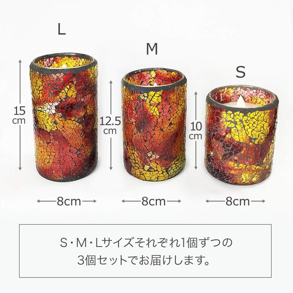 【商品仕様】サイズ:L(直径8cm×高さ15cm)、M (直径8cm×高さ12.5cm)、S(直径8cm×高さ10cm)、個数:3個/点灯モード:揺らぎ・一定 キャンドル本体の電池:単3電池(各2本・別売り) リモコン用電池:ボタン電池1個(付属)