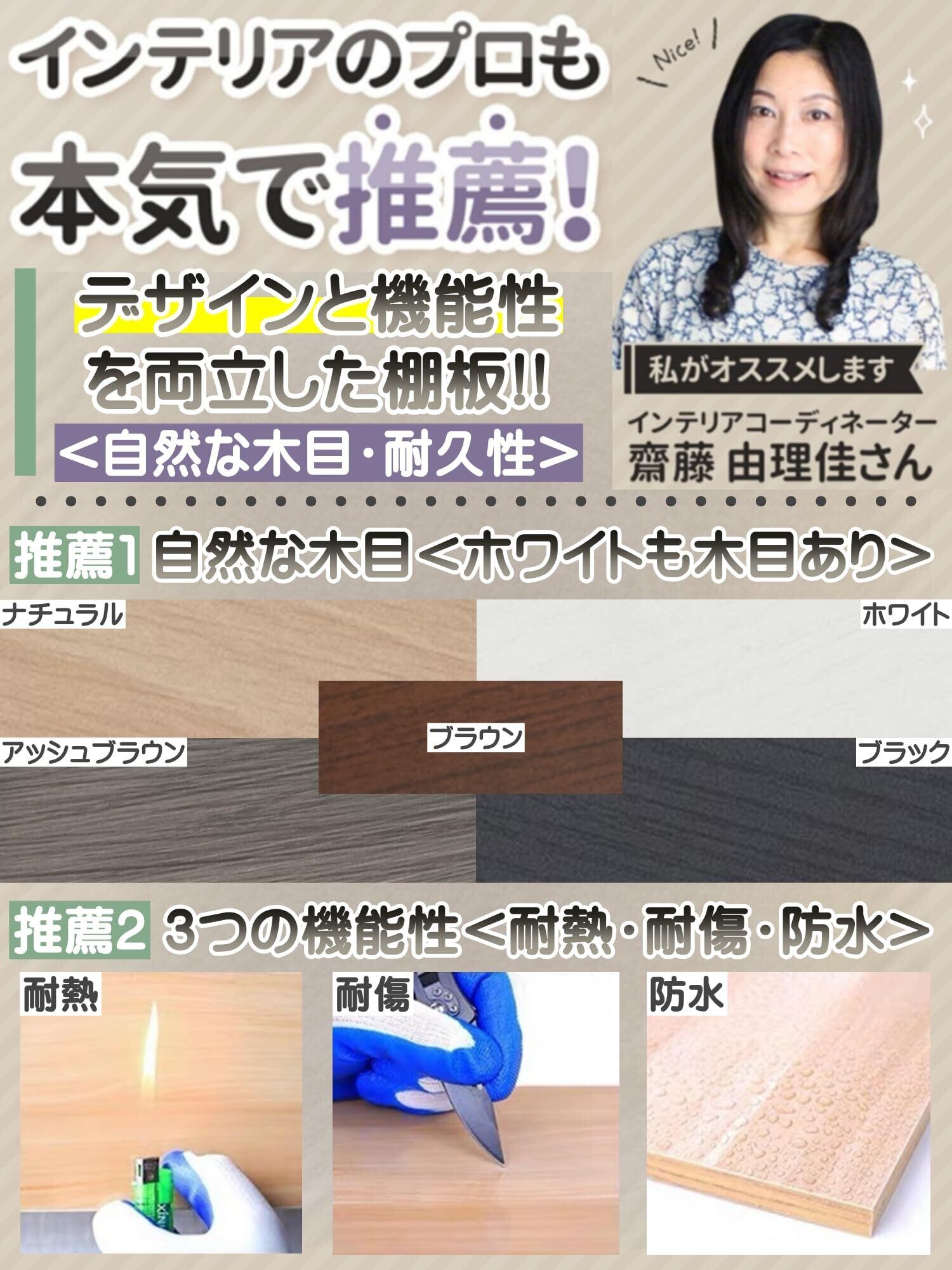 【高品質の棚板】《3つの耐性》耐久性・耐水性・耐傷性に優れた、長くご愛用頂けるシェルフです。《自然な木目》ホワイト、ナチュラル、ブラック、アッシュブラウン、ブラウン全色自然な木目がお部屋に彩りをプラス。、ディスプレイを引き立てます!