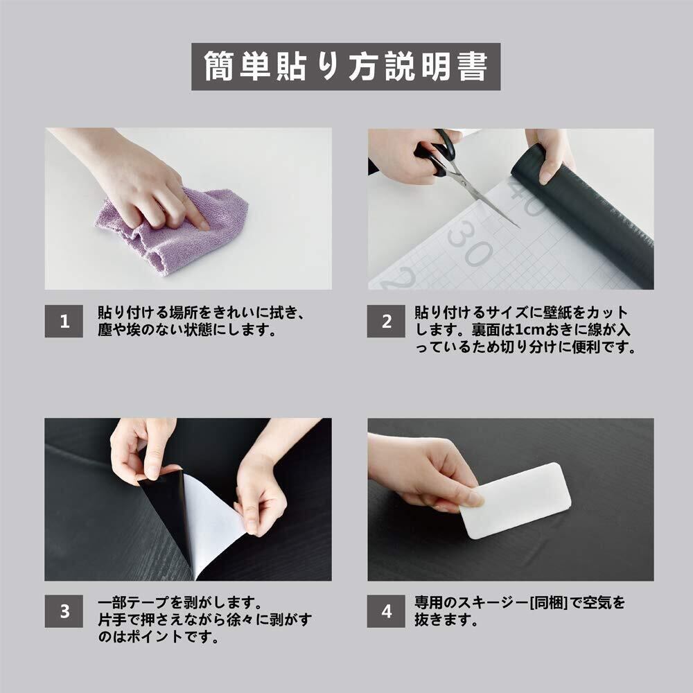 【貼り付け簡単・賃貸OK】シートの裏面はシール状になっていて、施工するときは台紙を剥がしてペタッと貼るだけ。0.29mmもある厚手の壁紙なので下地が透けなく、貼り付け時に空気が入りにくく貼りやすいです。また、60cm幅なので初心者でも簡単にリメークができ、時間も短縮!