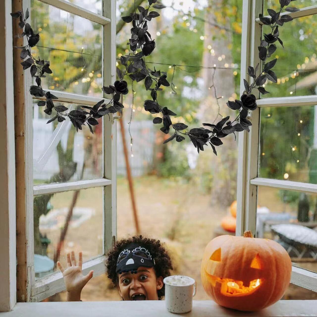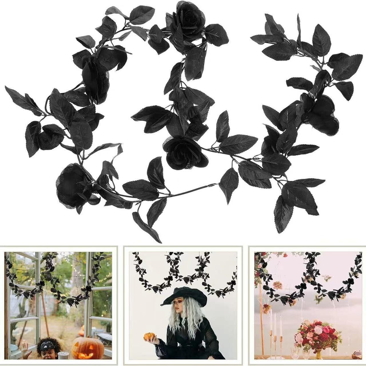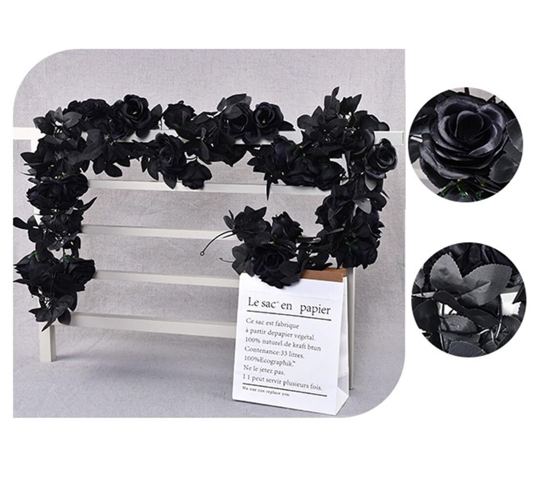 ハロウィン装飾:黒のバラの造花ガーランドは美しくてユニークに見えます。このフラワーガーランドでお部屋を飾ると、ハロウィンパーティーの不気味な雰囲気を完璧に作り出すことができます