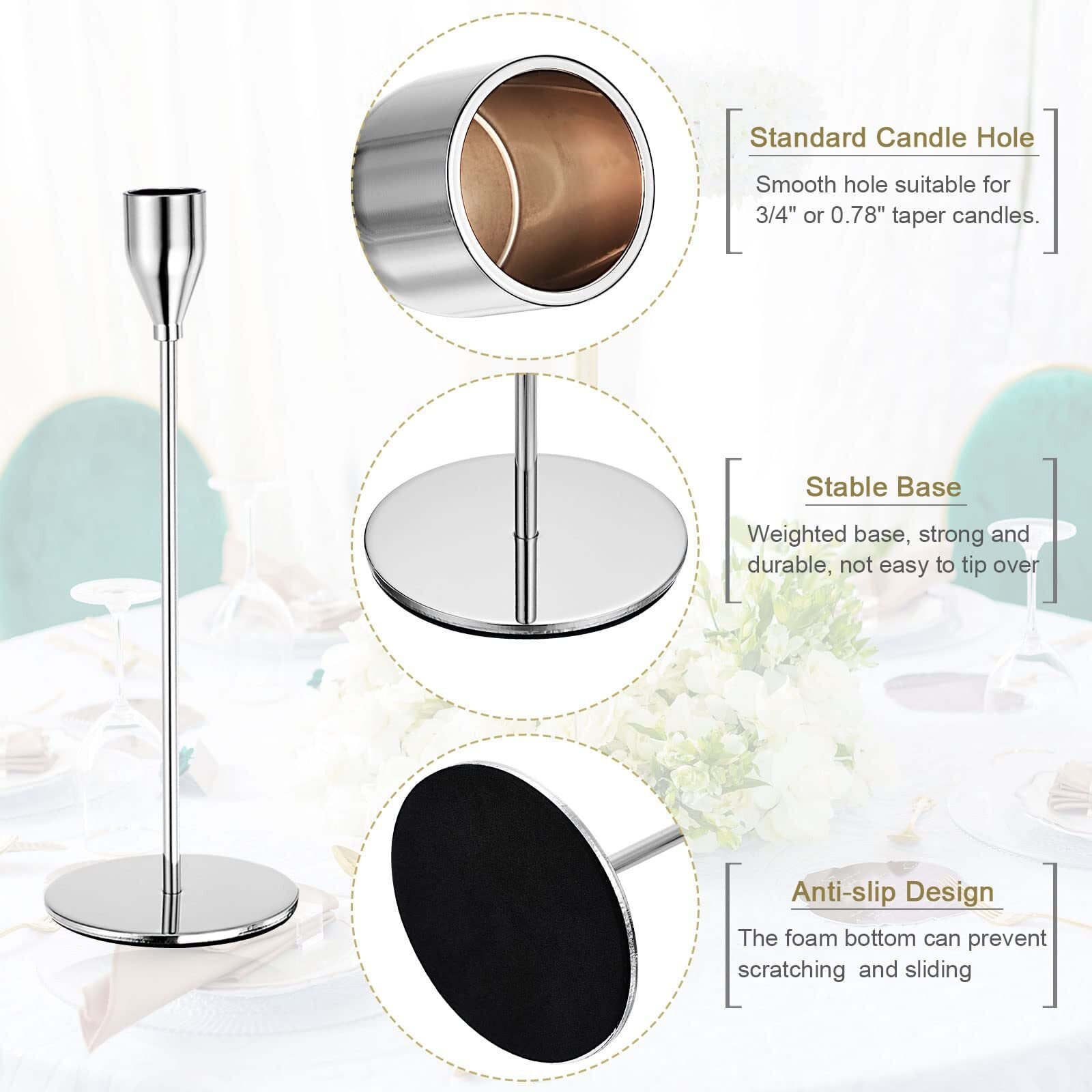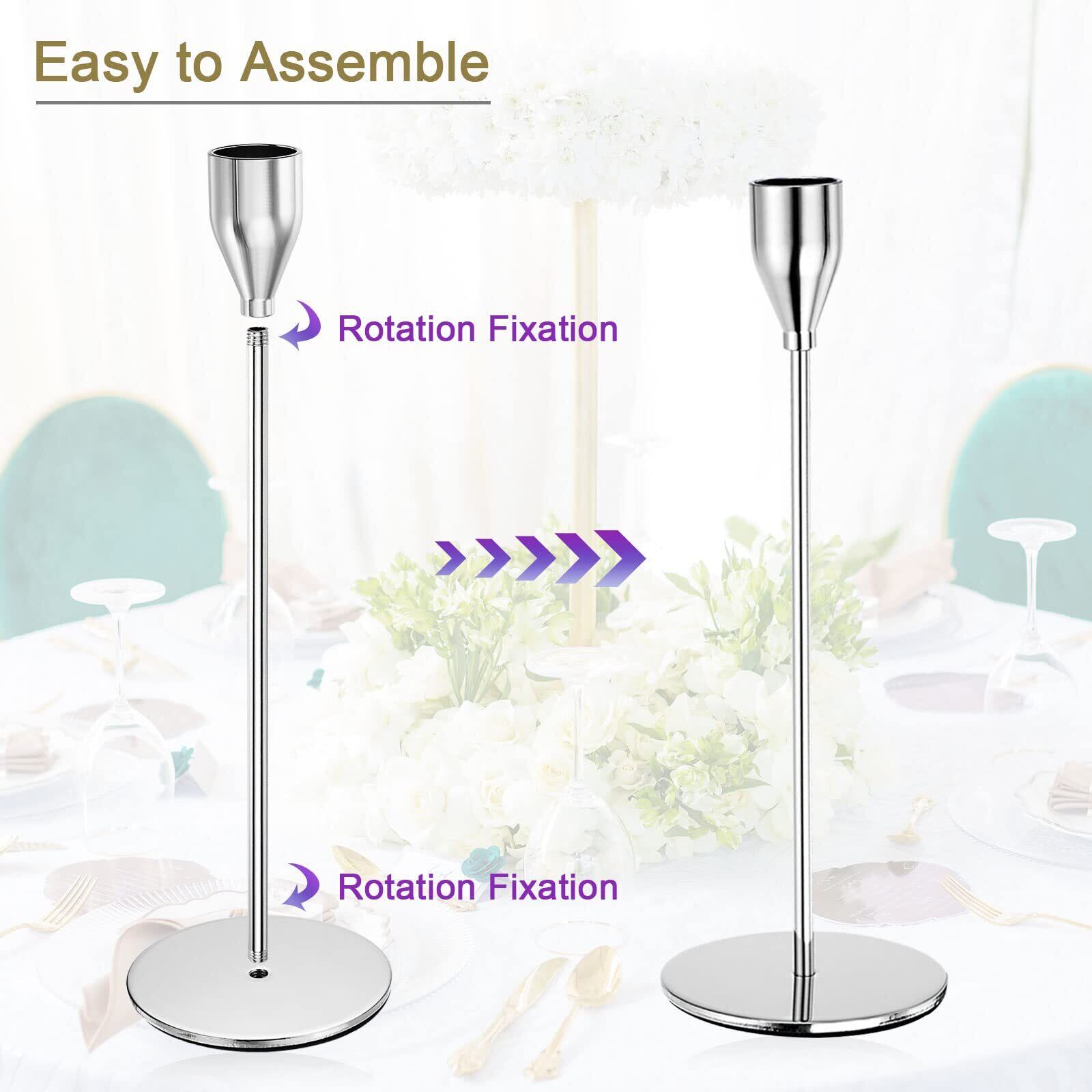 これらの先細キャンドルホルダーは固体金属で作られています。銀面のデザインが美しくエレガントで、エレガントな印象を与えます。キャンドルホルダーは防錆、耐腐食性があり、重みのあるベースが装備されており、強くて耐久性があり、転倒しにくいです。各テーパードキャンドルホルダーの底には滑り止めフォームが付いており、テーブルトップを傷つけません。
