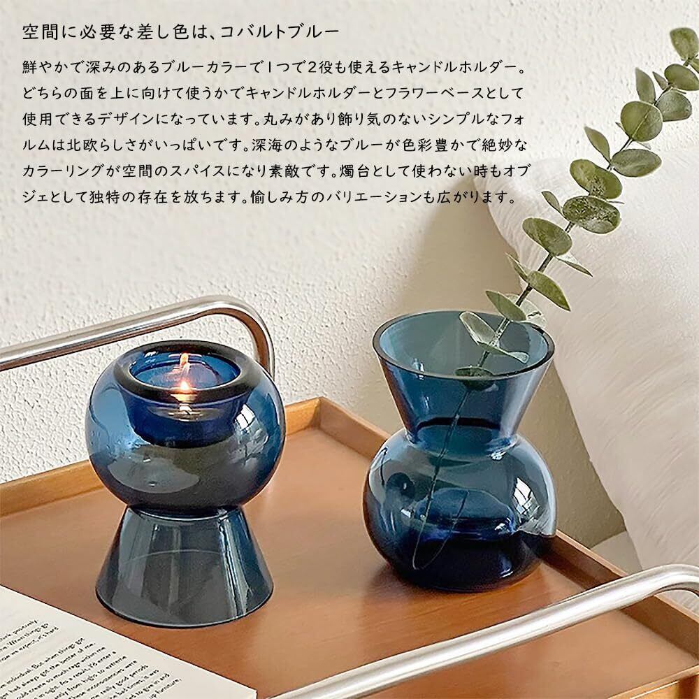 空間に必要な差し色は、コバルトブルー 鮮やかで深みのあるブルーカラーで1つで2役も使えるキャンドルホルダー。 どちらの面を上に向けて使うかで、キャンドルホルダーとフラワーベースとして使用できるデザインになっています。 丸みがあり飾り気のないシンプルなフォルムは、北欧らしさがいっぱいです。 深海のようなブルーが色彩豊か、絶妙なカラーリングが空間のスパイスになり素敵です。 燭台として使わない時もオブジェとして独特の存在を放ちます。愉しみ方のバリエーションも広がります。