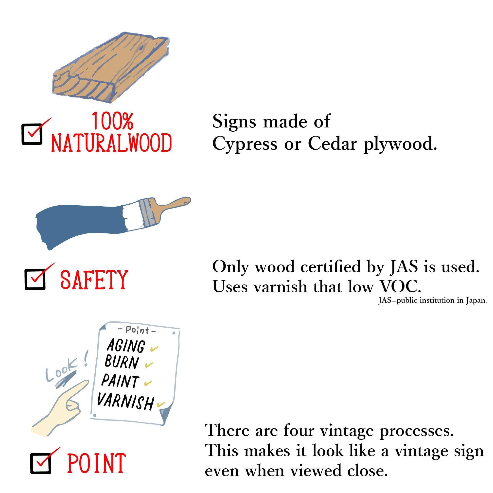 【食品衛生法適合の安全なニスを採用】木製看板の最表面は食品衛生法適合の舐めても問題ないニスを採用。本来は木製食器に使われるニスです。お子さんやペット、敏感な方がいる家庭も安心して飾れます。もちろん、木材、ニスともに、ホルムアルデヒド発散等級はFの最高等級品です。