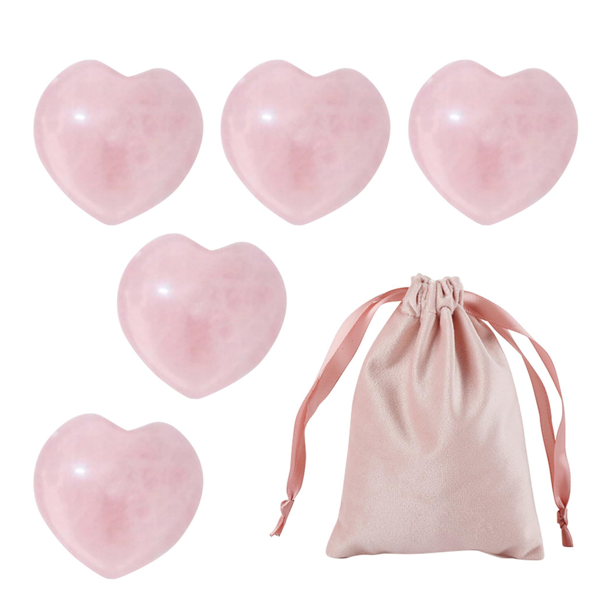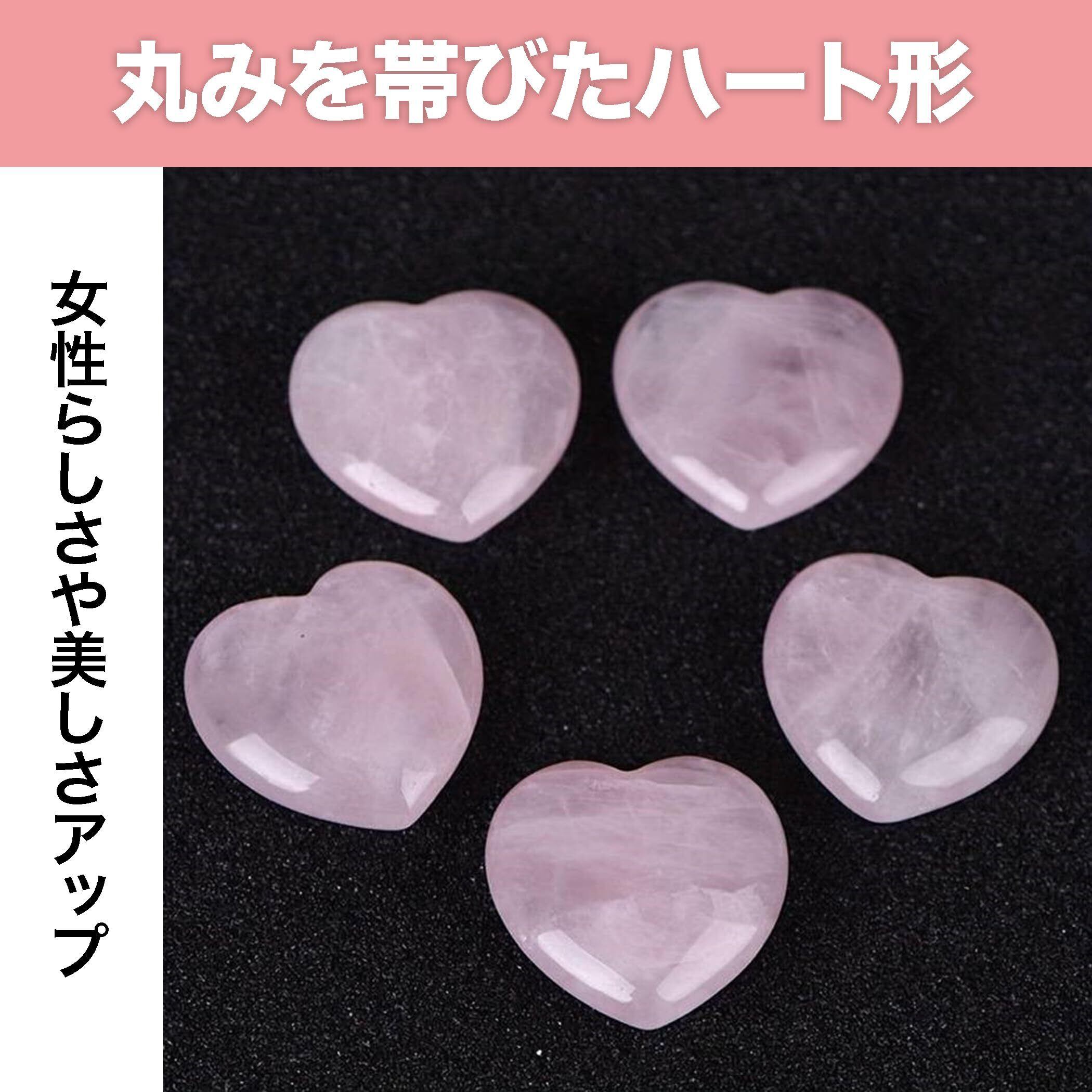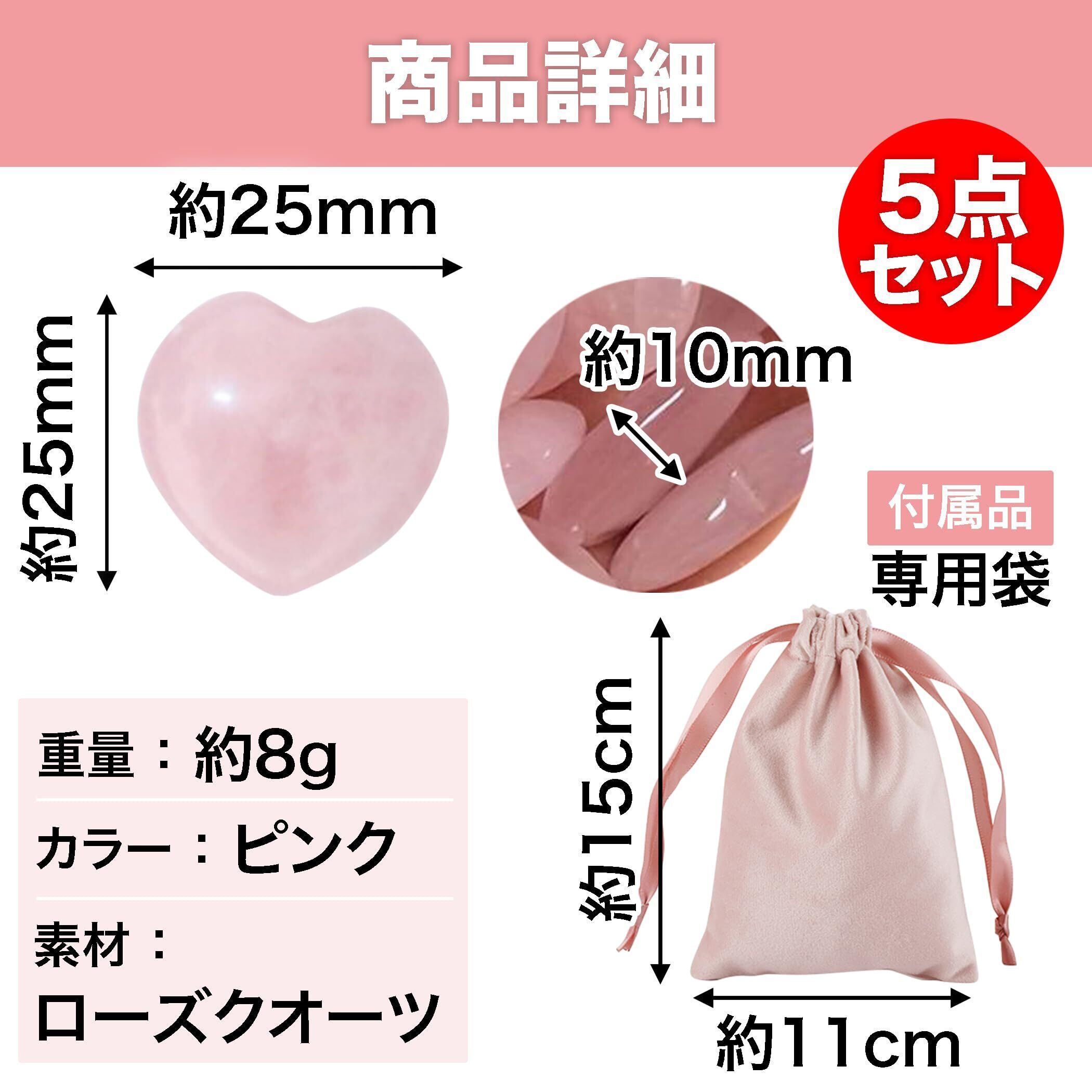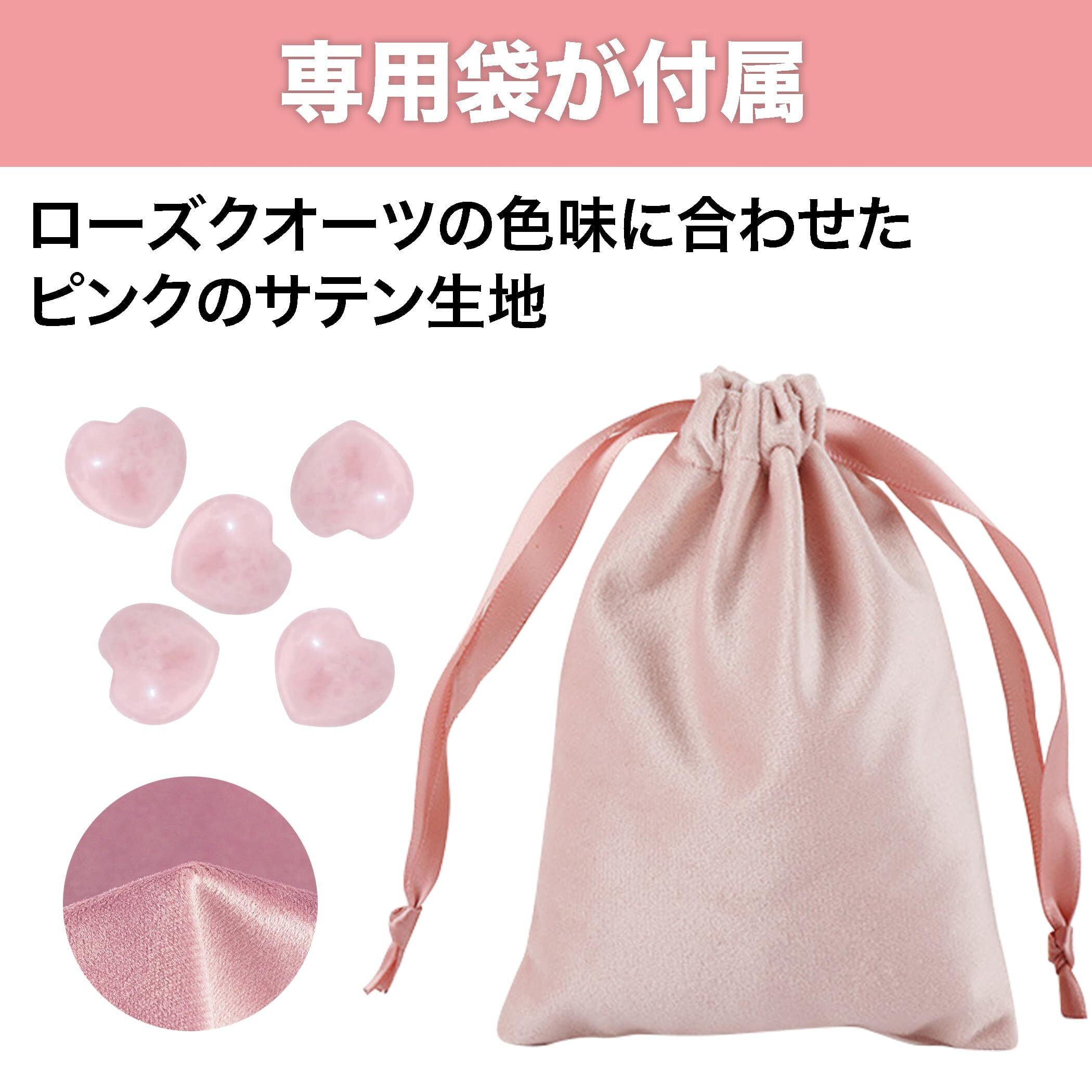専用袋が付属してお得な5点セット:こちらのハート形オブジェには、まとめて収納、携帯するのにぴったりの専用袋が付属しています。サイズは約11×15cmで、ローズクオーツの色味に合わせたピンクのサテン生地となっております。