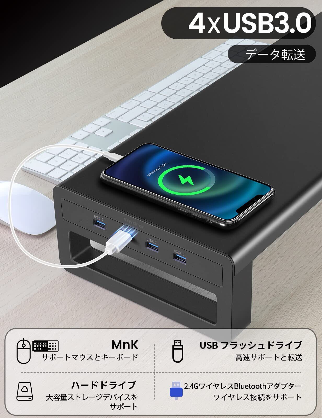 【USB 3.0 ポート】データ転送をサポートし、4 つの USB 3.0 ポートに対応するこのモニター スタンドは、ハード デバイス、携帯電話、iPad、Kindle などにデータ アクセスするのに非常に便利です。大容量 (ハードディスク デバイス) の場合 ストレージは1T以上です。外部電源用に10W充電器(DC 5V / 2A)を購入してください。パッケージには含まれていません。 注意してください: USB ポートは充電をサポートしていません!