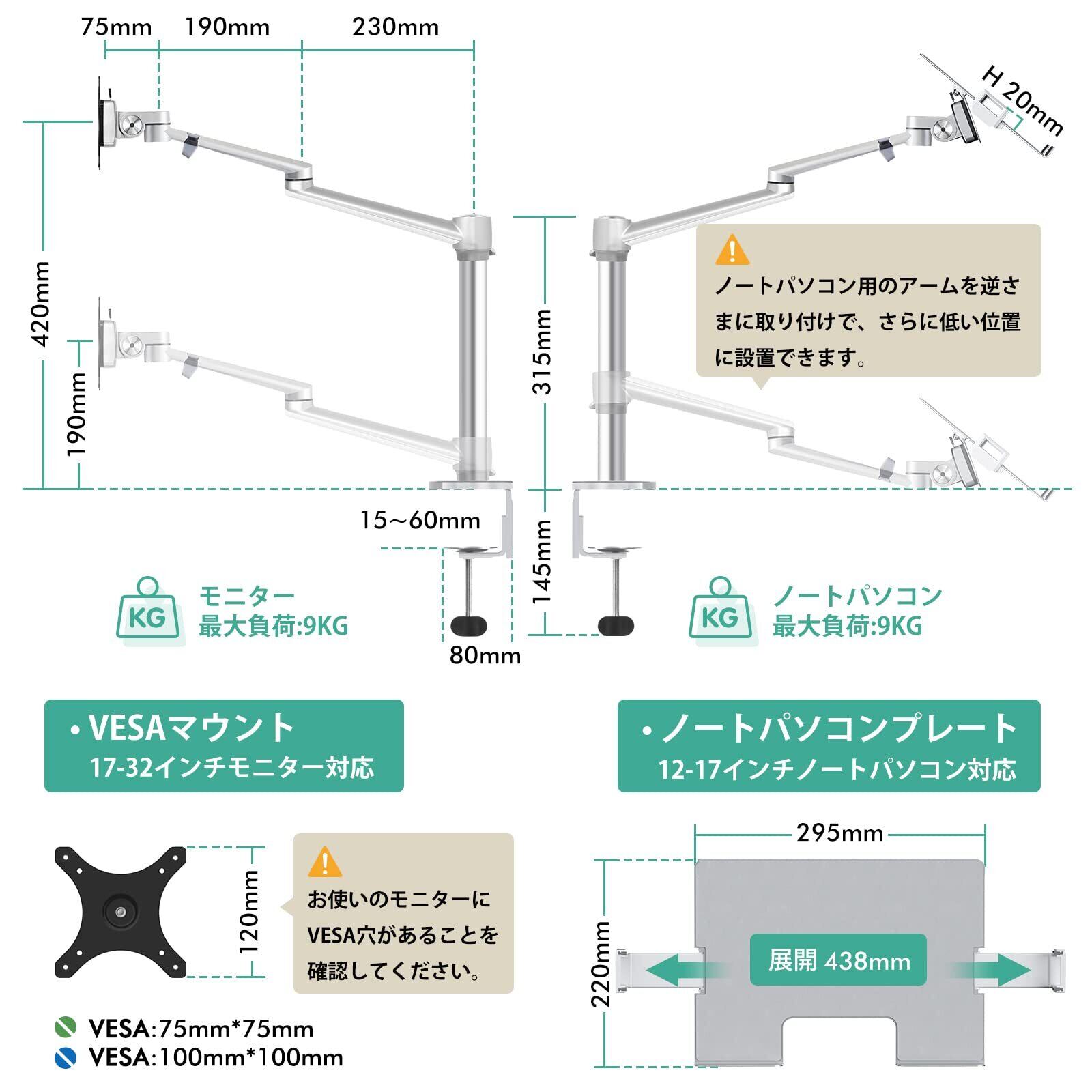 幅広い適応性:このモニター・ノートパソコンスタンドは17-32インチのVESA穴付き(100X100 mm と 75x75 mm)モニター(DELL、サムスン、HP、Acer、ViewSonic、LG、HP、AOCなどのLCDモニター)、および12-17インチのノートパソコンに対応します。