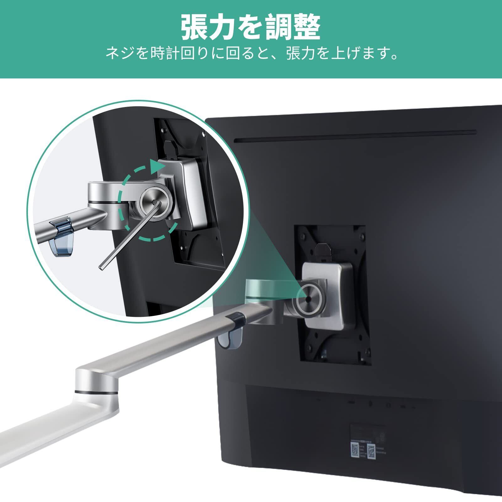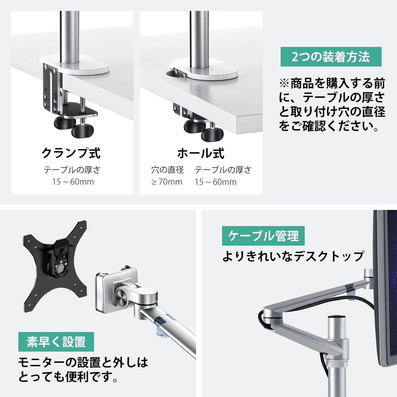 調整可能:モニターアームは360度で回転でき、あらゆるところで止めることができます。アームは最大145度に傾け、最大長さ52cm、最大高さ43cmに広げることができます。