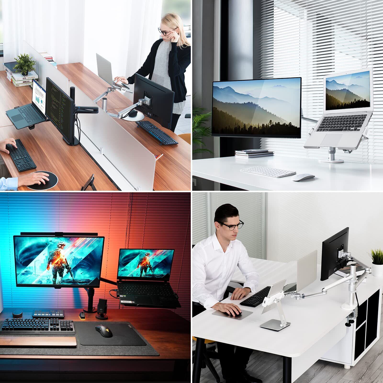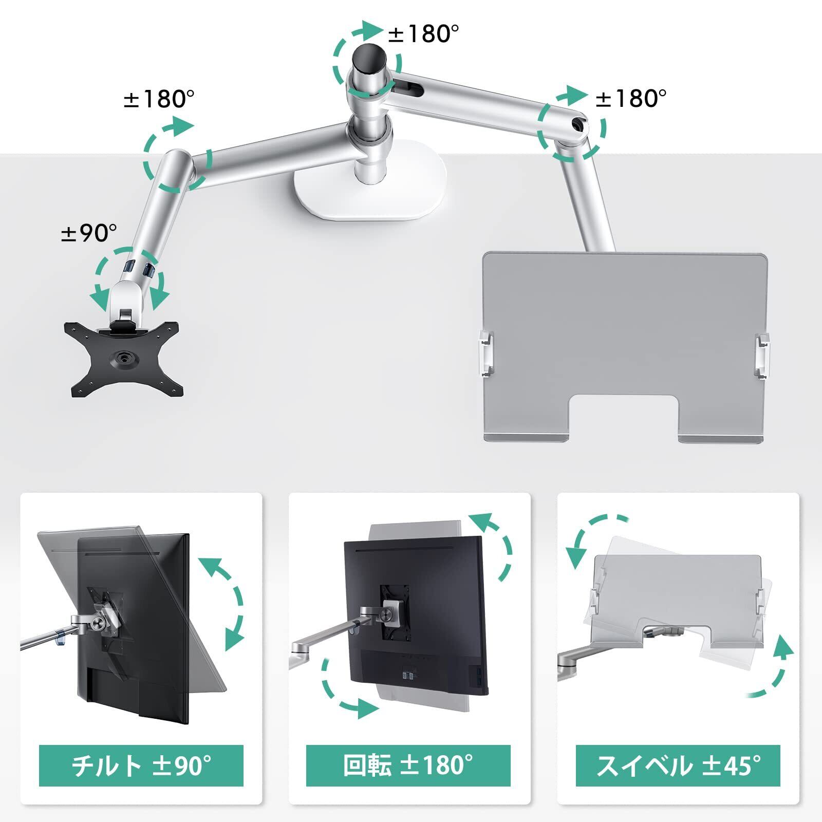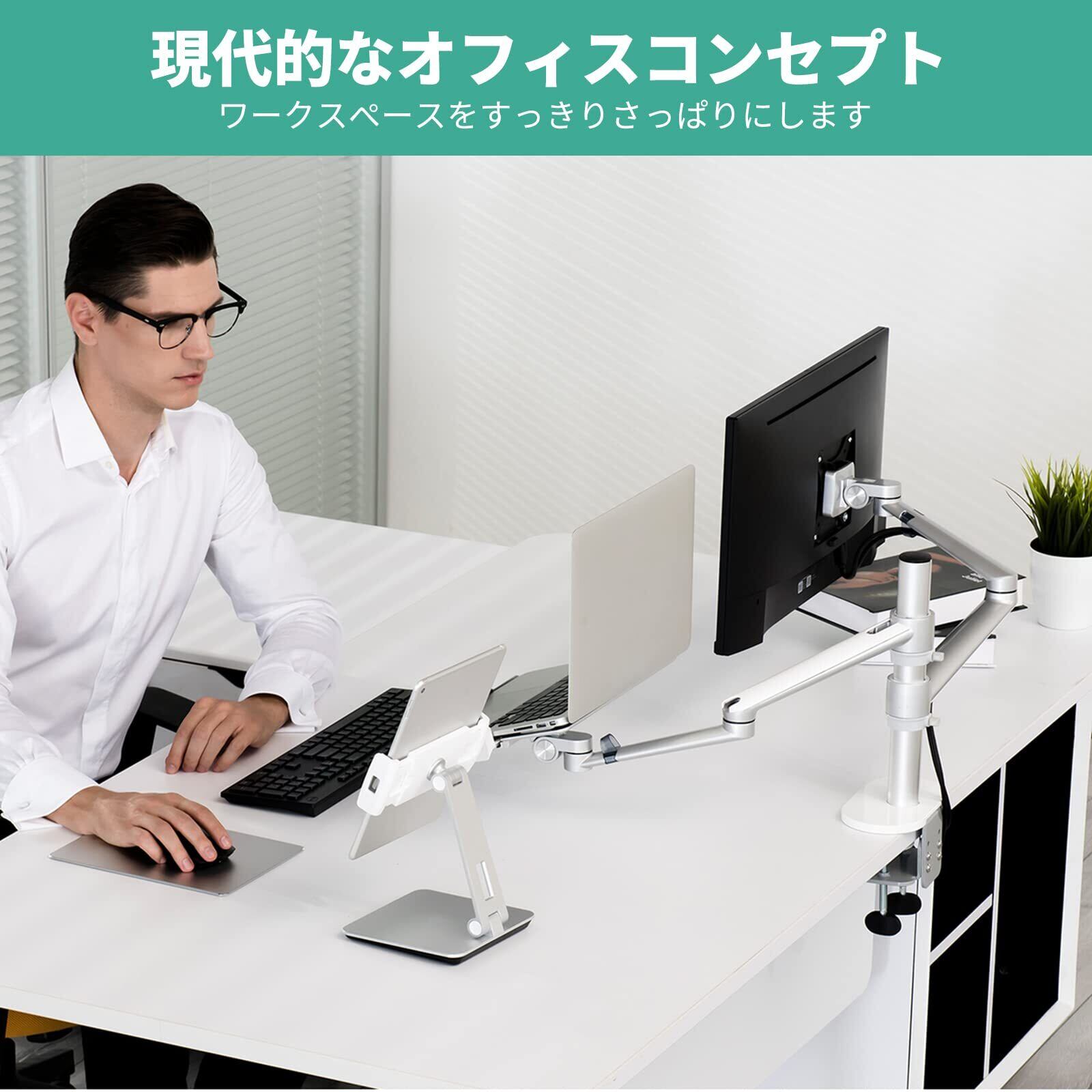Viozon モニター・ノートパ ソコンスタンド アーム 2in1高さ角度調整可能 卓上スタンド アーム付き 17-32インチのモニターを⽀持 12-17インチのノートパソコンに対応(銀)