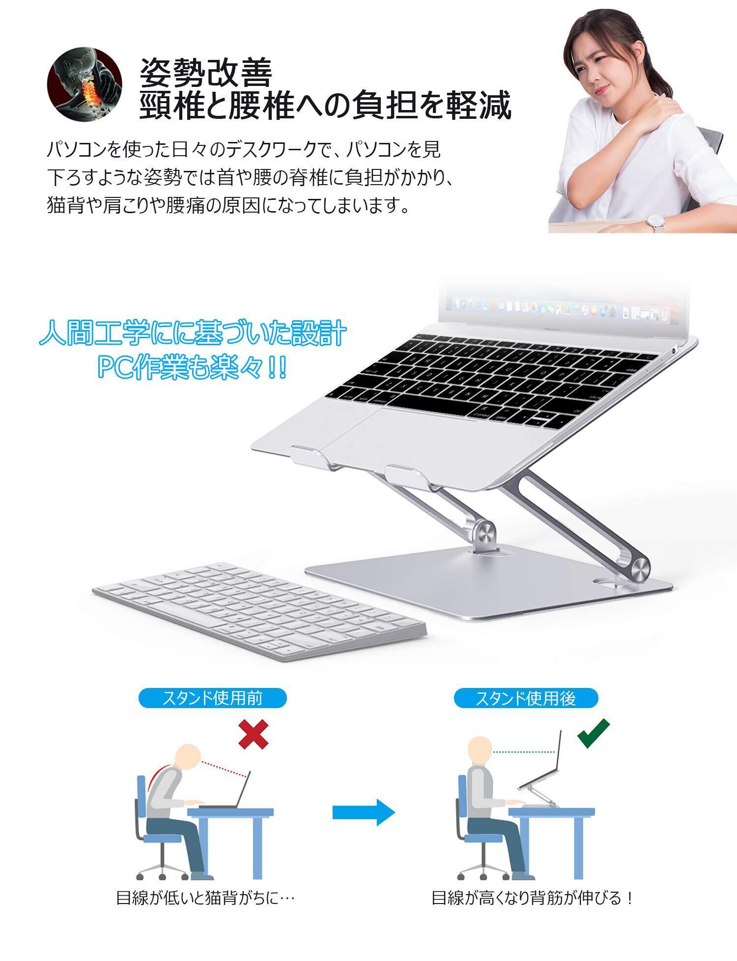 ●【滑り止めの面積が広い】:他社製品と比べ、ノートPCと接触する部分に広いシリコンゴムを使用しており、外装を傷つける心配もなく安心してご使用いただけます。さらに、滑り落ちを防止するストッパー部分や底面には4つのゴム足が付いており、スタンドの安定性を確保し、テーブルへの傷も効果的に防ぐことができます。 ●【熱くなりにくい仕様】:アルミの素材とスタンドの天板部分の通気口により通常よりも排熱が効率よく、夏などの熱がこもりやすい時期にも◎です。