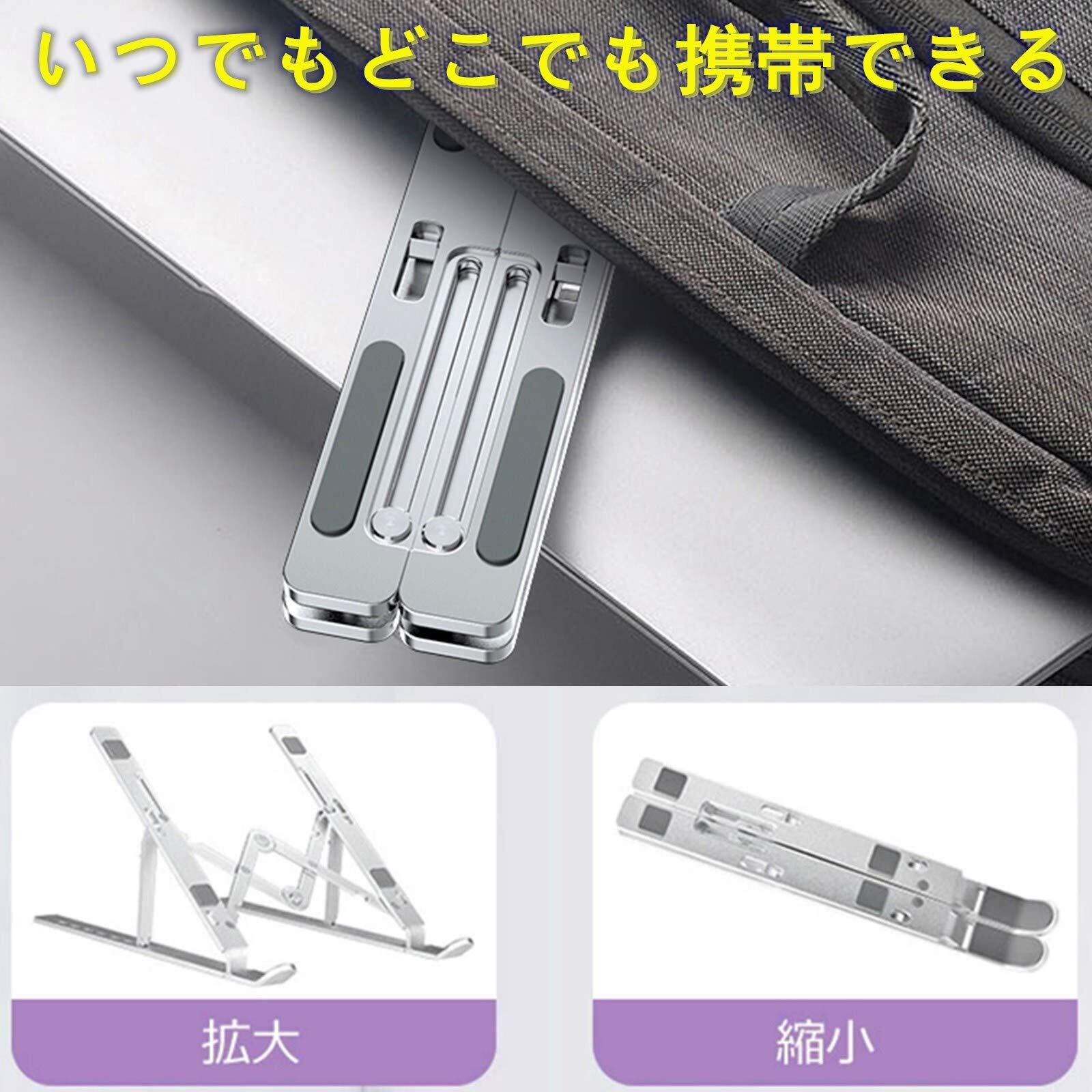 【折り畳み式&持ち運び便利】折りたたみ式スタンドは軽くて収納簡単で、いつでもどこでも携帯できる。折りたためたサイズは25cm*4.5cmで、重さは約260gです商品は収納バッグも付いていますので、スーツケース、リュック、ハンドバックで収納できます、ノートパソコンを外出先で使うことにも便利です。また、表はアルミニウムで、触れると金属素材ならではの冷たさを感じられて、手触りはスムーズで高級感があります。