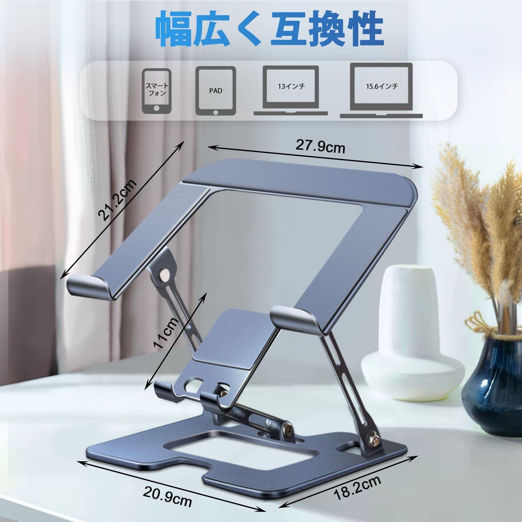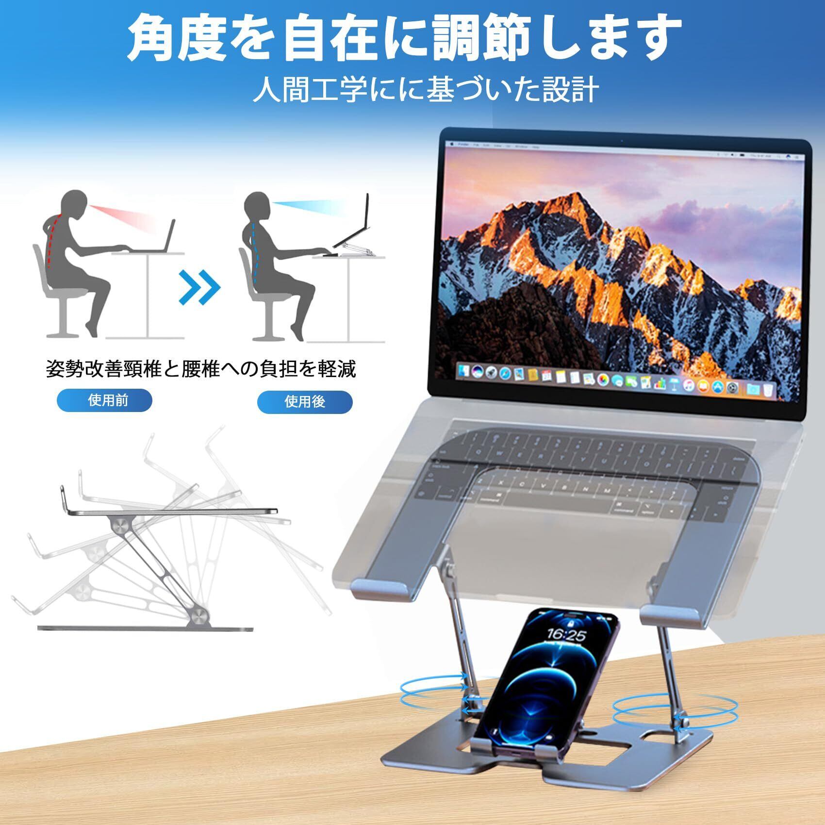 ノートパソコンスタンド スマホスタンド付 パソコンスタンド 折りたたみ式 pcスタンド 無段階高さ&角度調整可能 タブレット スタンド 滑り止め アルミ製軽量 安定 高耐荷重 放熱対策 省スペース 人間工学設計 姿勢改善 腰痛&猫背&肩こり解消