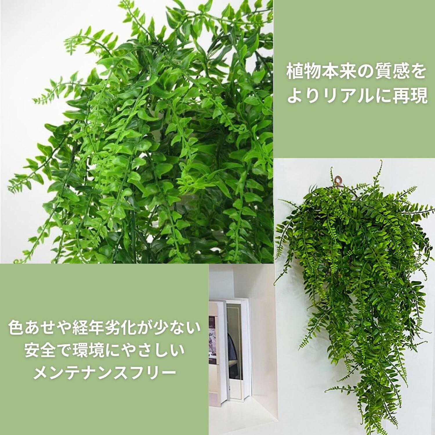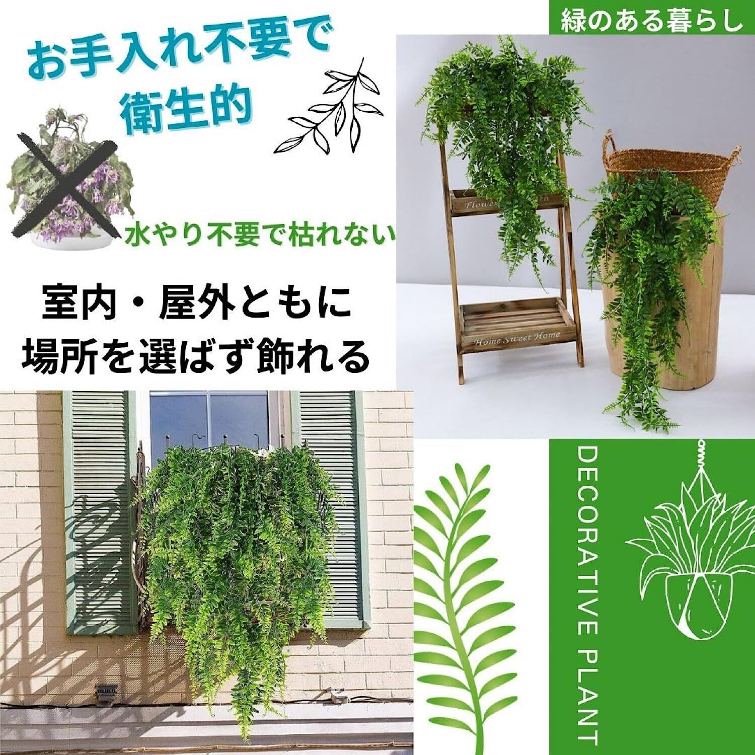 【メンテナンスフリーの快適さと耐久性】 この人工シダは、プラスチックと鉄ワイヤーで作られ、UV耐性を備えています。外見は自然で、環境に優しく、お手入れの必要も一切ありません。水やり不要、虫も寄り付かず、埃が気になった際は水で軽く洗うだけで綺麗になりリフレッシュされます。忙しいライフスタイルの中でも、常にフレッシュなグリーンを楽しめます。