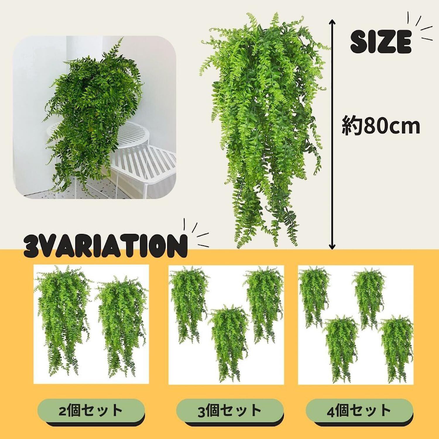 【メンテナンスフリーの快適さと耐久性】 この人工シダは、プラスチックと鉄ワイヤーで作られ、UV耐性を備えています。外見は自然で、環境に優しく、お手入れの必要も一切ありません。水やり不要、虫も寄り付かず、埃が気になった際は水で軽く洗うだけで綺麗になりリフレッシュされます。忙しいライフスタイルの中でも、常にフレッシュなグリーンを楽しめます。 【多用途で自由な装飾】 このフェイクシダは、ご自宅のリビングやバスルーム、玄関はもちろん、パーティーや結婚式、結婚式の2次会などイベントのデコレーションにもぴったり。屋内外問わず、壁やバルコニー、ガーデンに吊り下げたり、DIYブーケやセンターピースに組み込むことで、空間に温かみのあるグリーンを加えられます。 【持続する美しさ】 豊かな緑の葉と自然な質感が、季節を問わず空間に彩りを提供します。耐UV加工された素材で、外で使っても色あせることなく、長く美しさを保ちます。どんな天候にも対応し、手間をかけずに四季折々の景色を作り出せます。 【サイズ感と存在感】 全長80cm (31.5インチ) の吊り下げタイプで、単体でも可愛らしく、複数個並べると一層オシャレでボリュームのある装飾に。どんな空間にも自然なエレガントさをプラスし、豊かな緑がインテリアのアクセントとして映えます。 【お手頃価格で贈り物にも最適】 母の日や記念日のギフトにも最適です。贈り物としても、手間いらずでいつまでも新鮮なグリーンが楽しめるため長く喜ばれます。2個セット