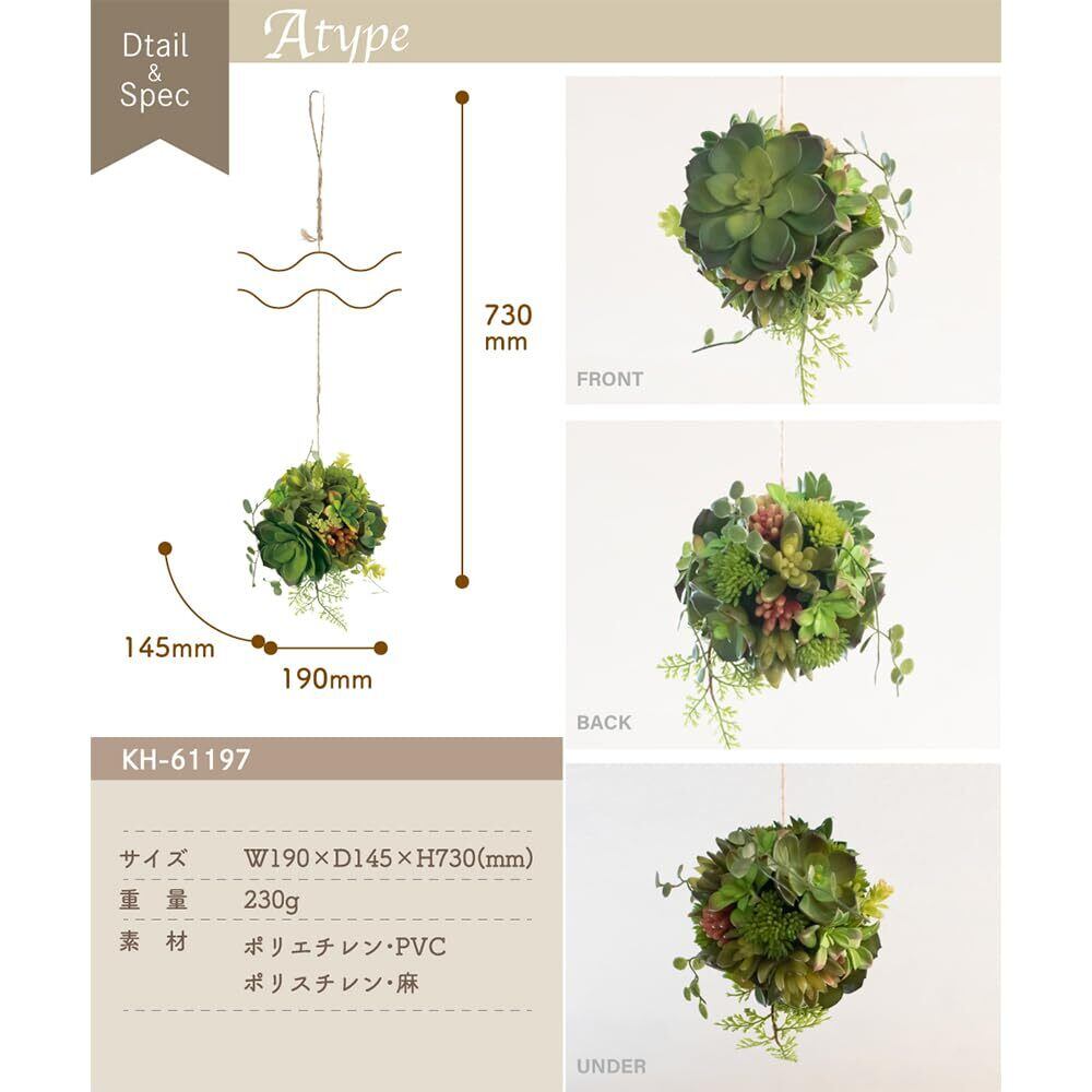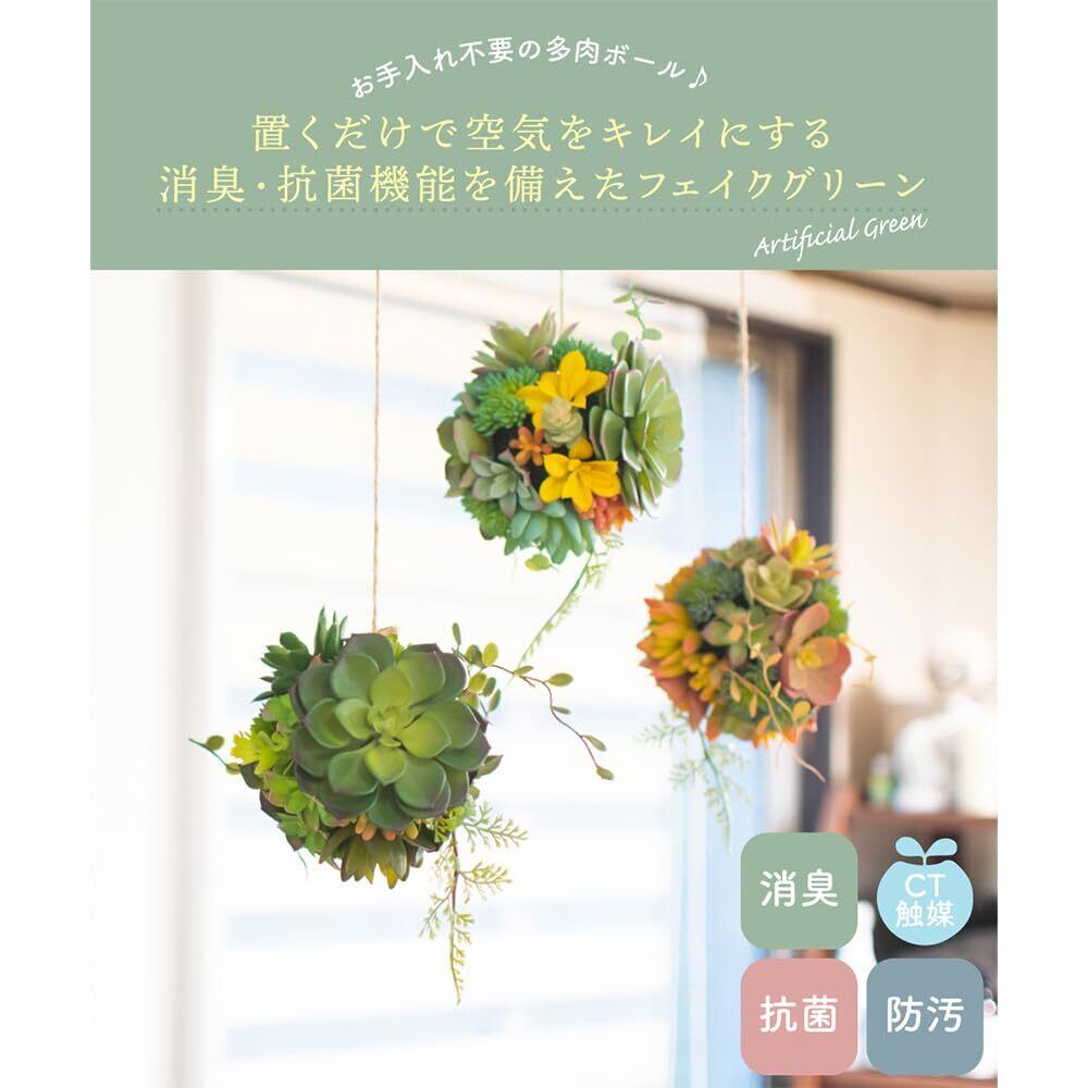 『手軽に飾れるフェイクグリーン』憧れの多肉ボールが手軽に飾れるお世話いらずのフェイクグリーンです。ひもの先が輪っかになっているので、フックなどに引っ掛けるだけでOK!フェイクならではの個性豊かな形&カラーが楽しめるアイテムです。CT触媒加工を施しているので、インテリアとしてだけでなく消臭・抗菌・防汚効果も期待できます。