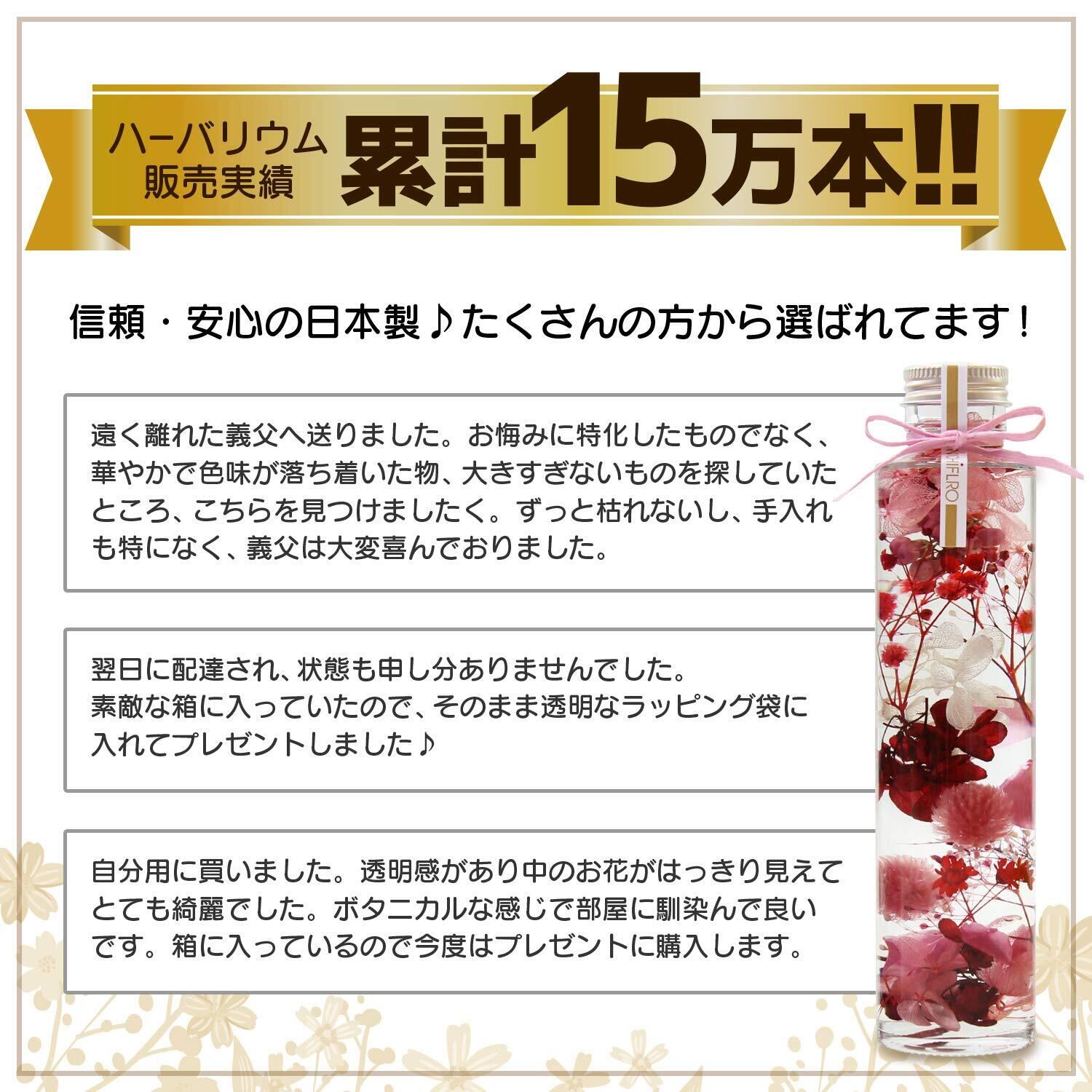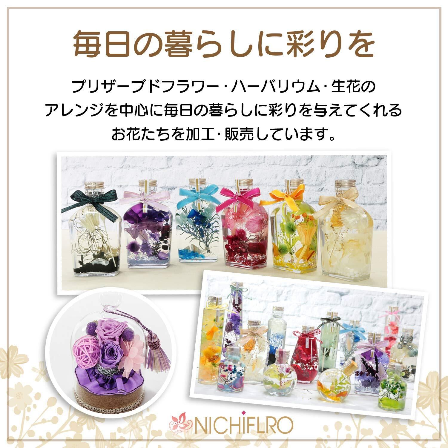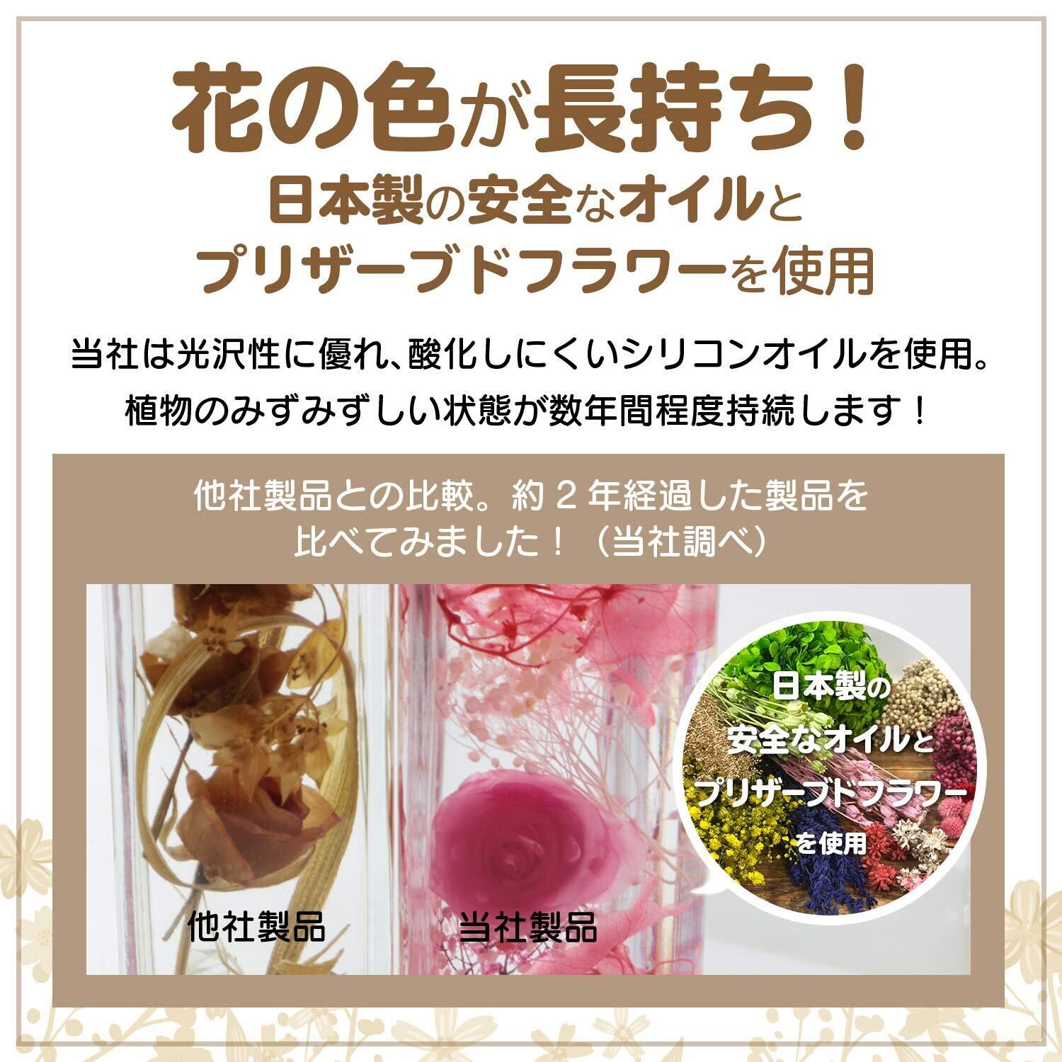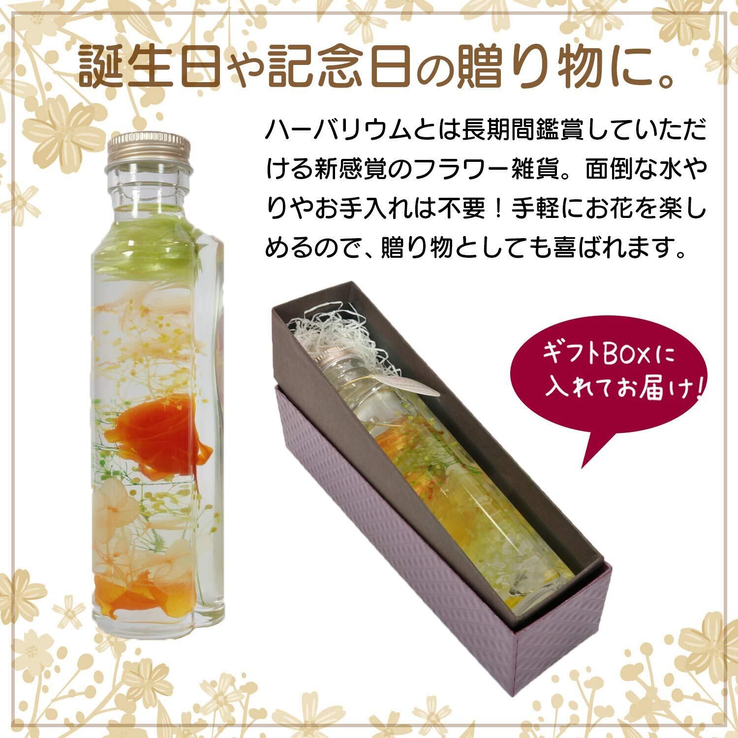 ●【商品サイズ&こだわりの仕様】 ガラス瓶:Φ7.2×13.5H 内容物:≪良質な天然素材≫国内一流メーカー様から仕入れたプリザーブドフラワー、カラードライフラワーを使用。(造花不使用)●【安心の国内産高級シリコンオイル使用】安全性を考え、使用しているシリコンオイルは引火点330℃の非危険物であり、一般的に流通している流動パラフィンオイル等と比べ、花材との相性が良く透明感がある為、劣化が少なく変色を極力防いだクリアな仕上がりとなっております。●ハーバリウムは紫外線に弱い商品なので、日光が当たる場所を避けていただくと1年~2年程鮮やかさが保ちます。●ハーバリウムの世界観やイメージに合わせ、完全オリジナルデザインとして国内にてひとつひとつ丁寧に手作りで作成しております。ボトルの種類や、カラーも豊富に取り揃えておりますのでお好みのハーバリウムをお選び頂けます。