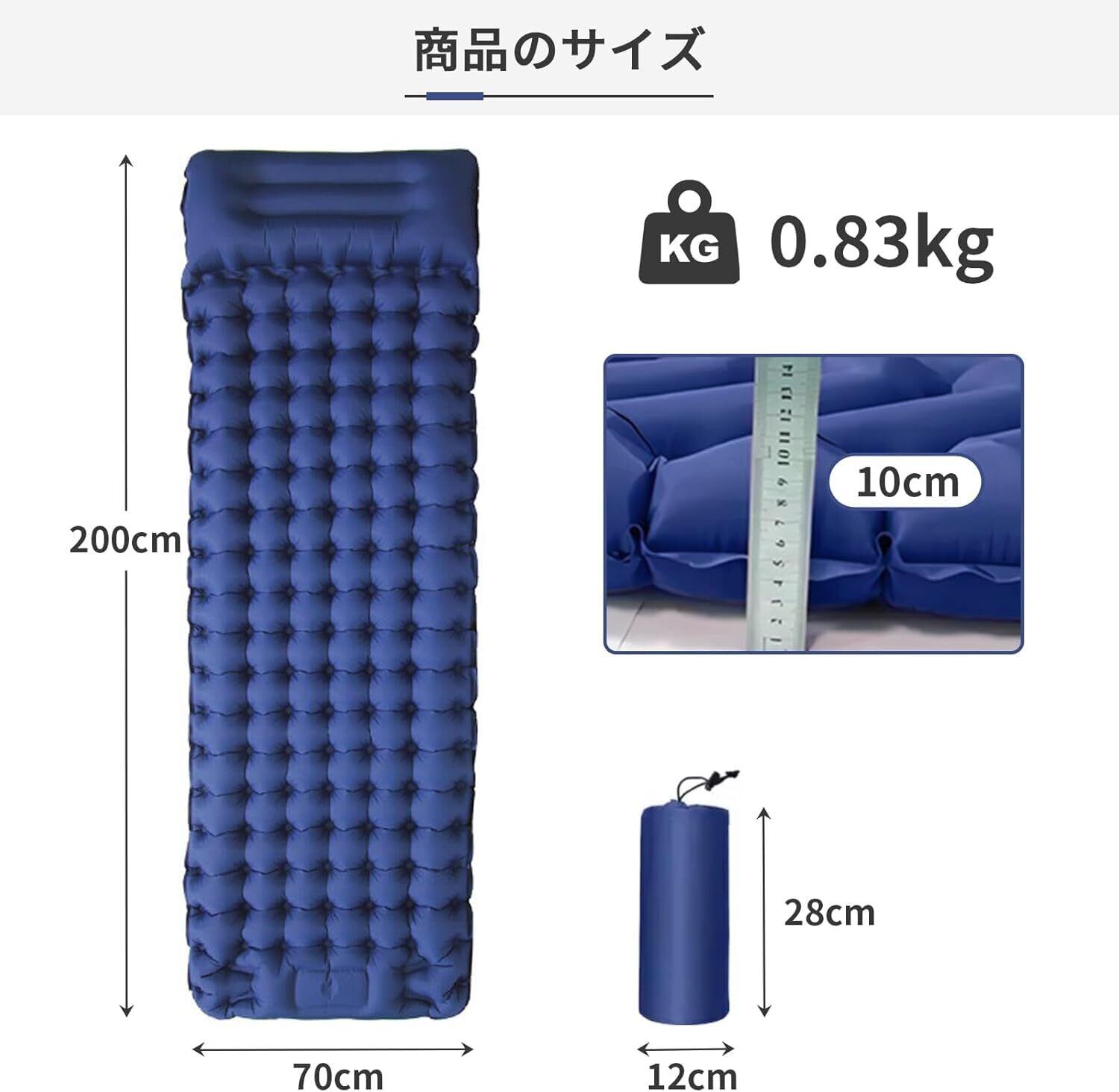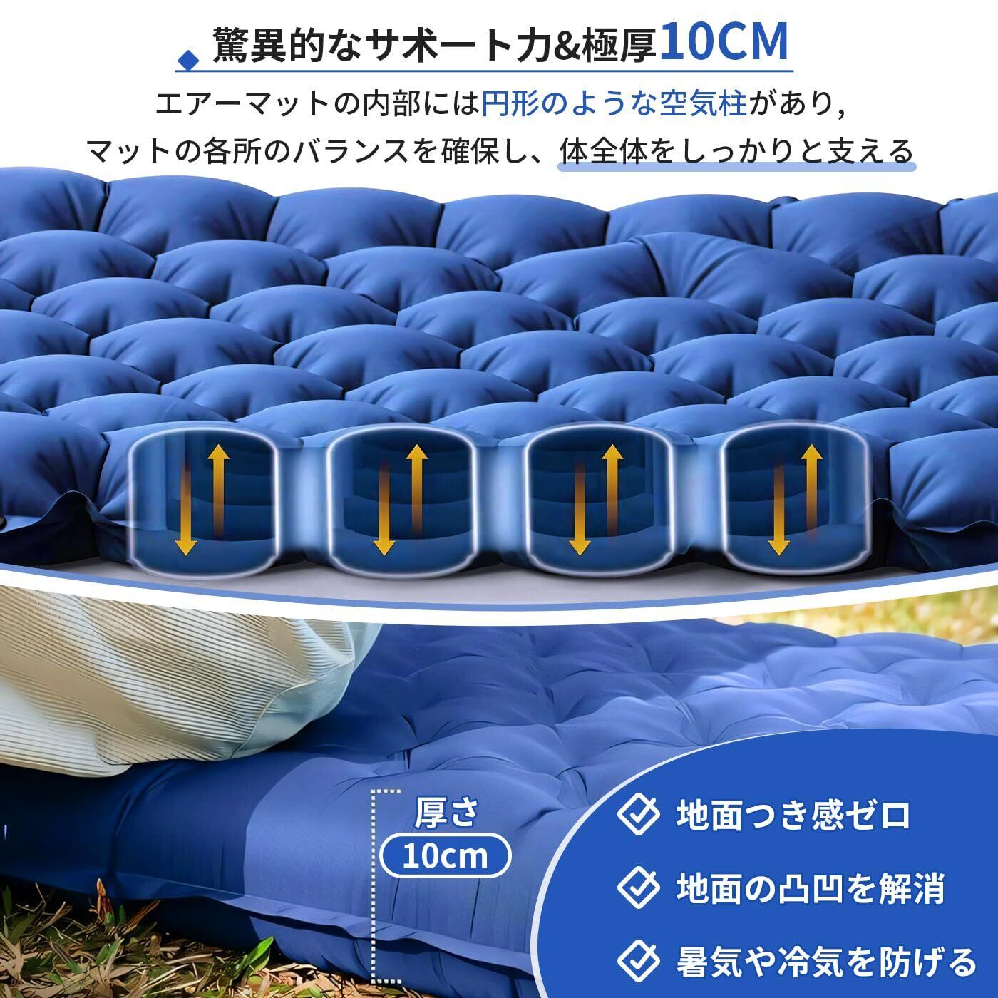 【優れた快適性・枕一体式寝心地よい】エアーマットのサイズは200*70*10cmで、地面の凹凸や硬い岩から守ります。革新的な凹凸設計と枕付きで、背中と首の圧力を軽減し、仰向けでも横向けでも快適な睡眠を提供します。夜の自然の音を聞きながら、まるで自宅のベッドで眠っているかのような安らぎを体感できます。どんなに過酷なキャンプ地でも、このキャンプ マットがあれば一日の疲れをしっかり癒せます。