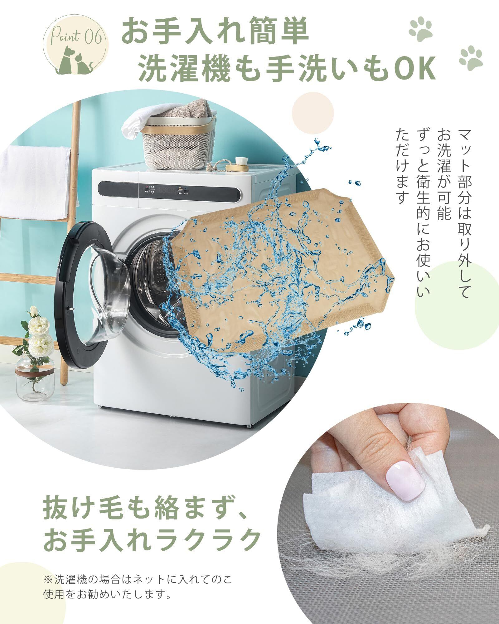 【お手入れ簡単】マット部分は取り外して洗濯機で洗えます。また、ペットの毛や土汚れ、芝生などから付着した汚れは、ホースで水をかけて乾燥させるだけで簡単にお手入れできます。さらに、濡れたタオルで拭き取ることも可能です。