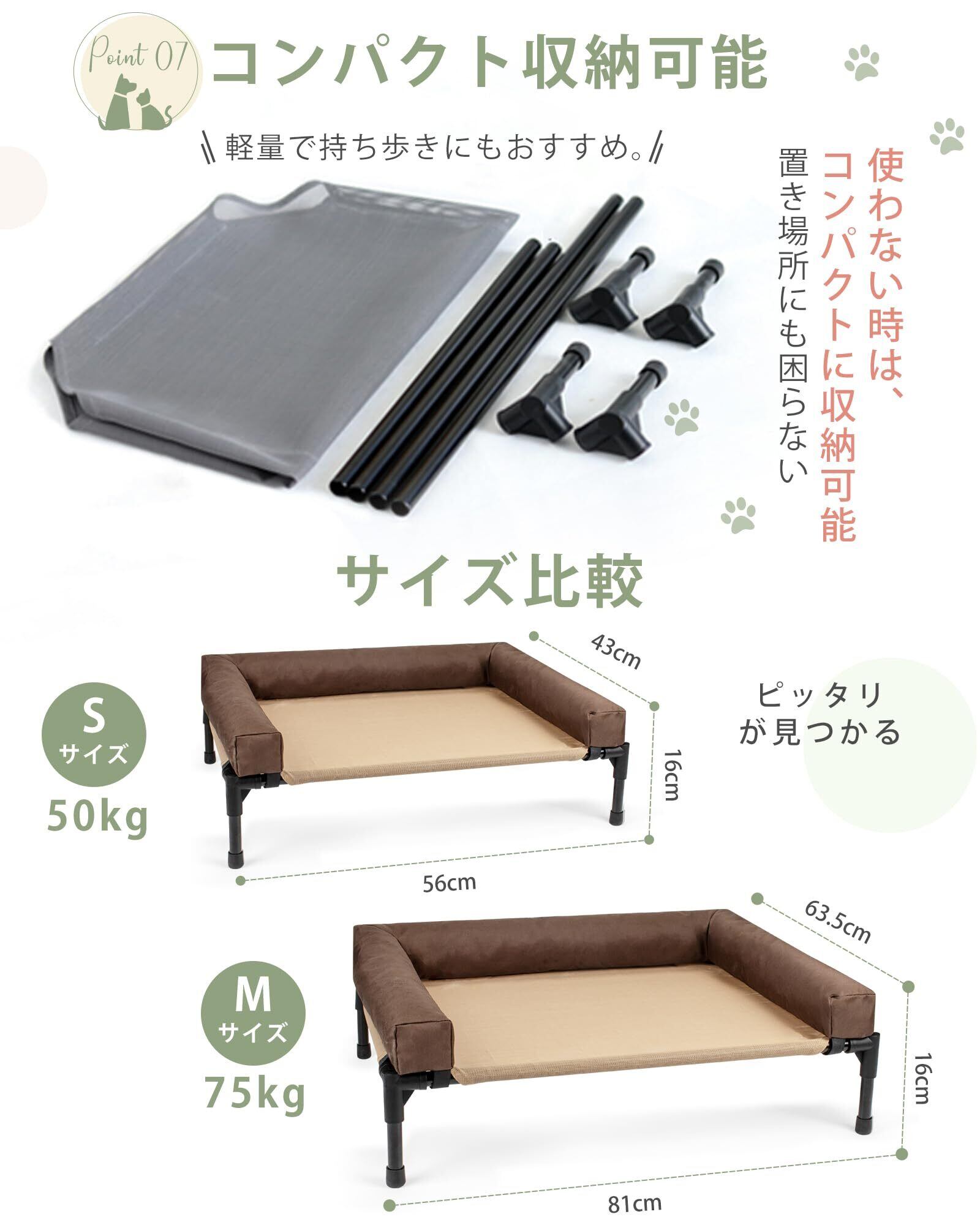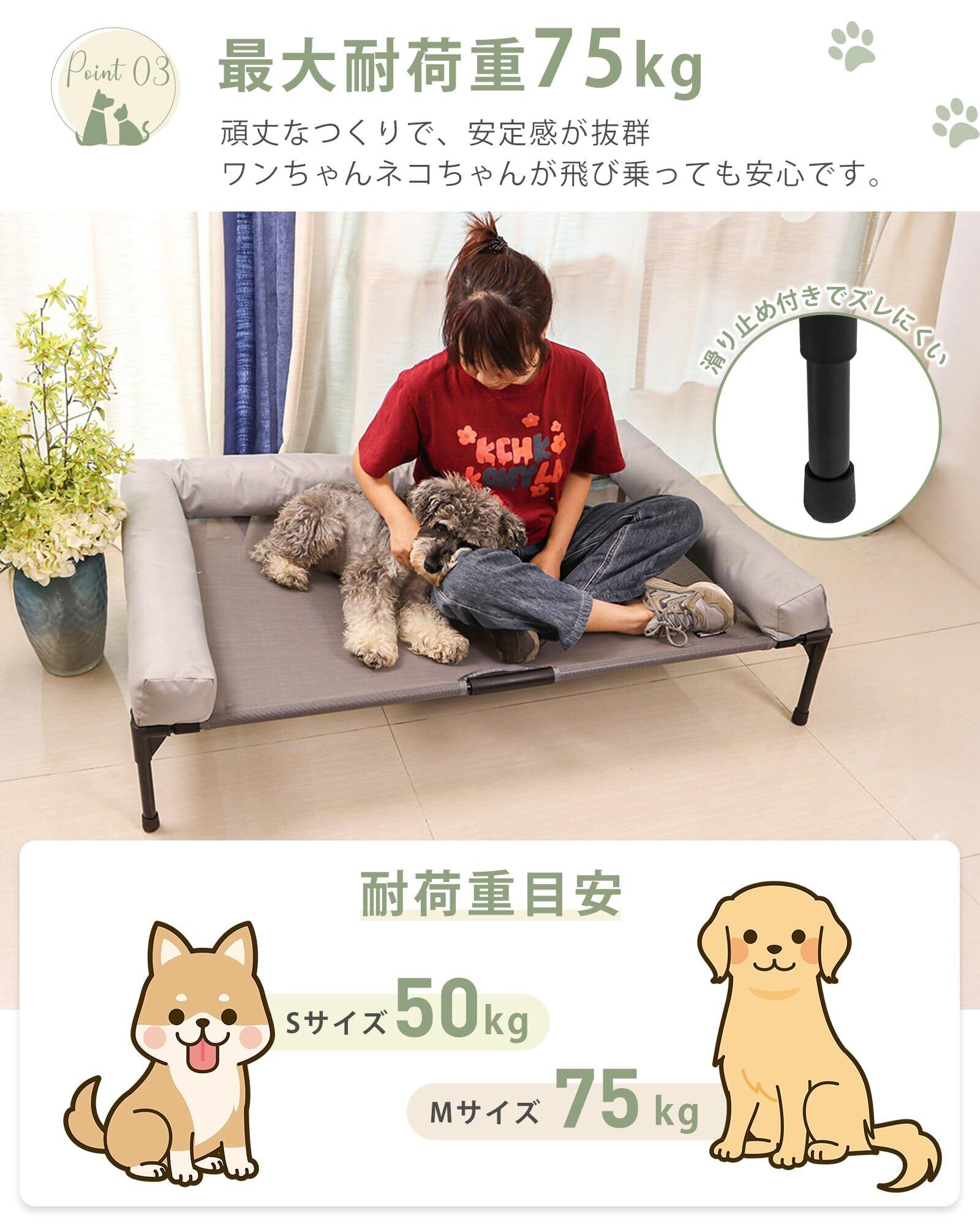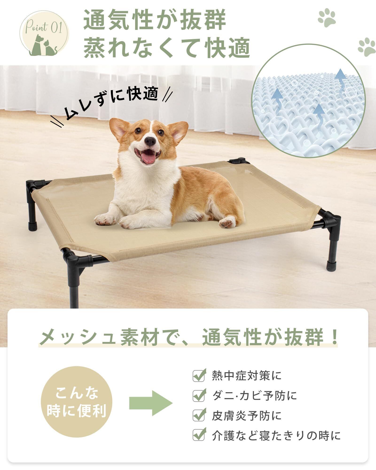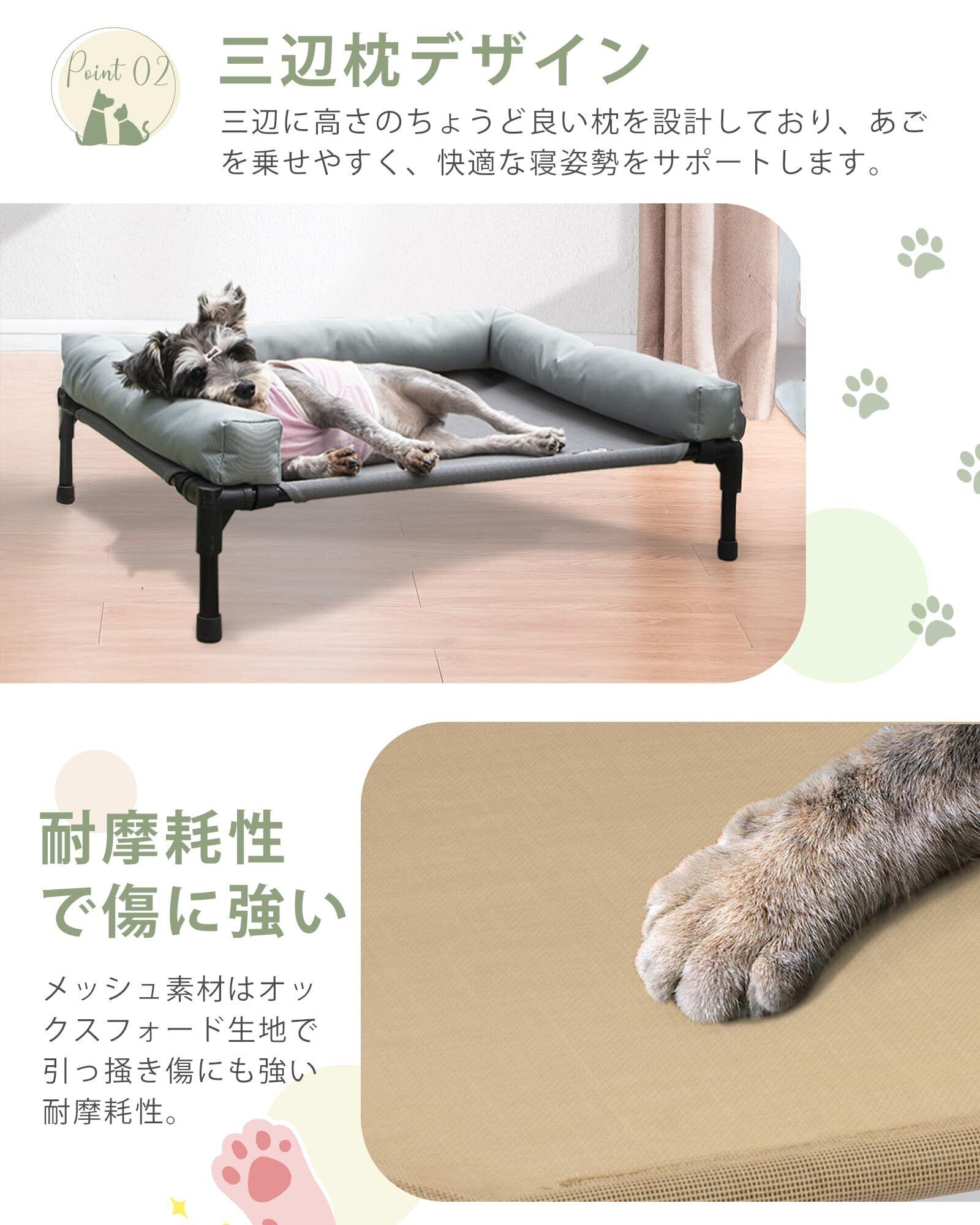 【床不要】地面から16cmの高さに設計されており、メッシュ生地が空気の流れを促進します。これにより、ペットは地面と比べて、より快適で清潔、乾燥した環境で過ごすことができ、健康的な生活をサポートします。夏は涼しく、冬は快適に使用できます。