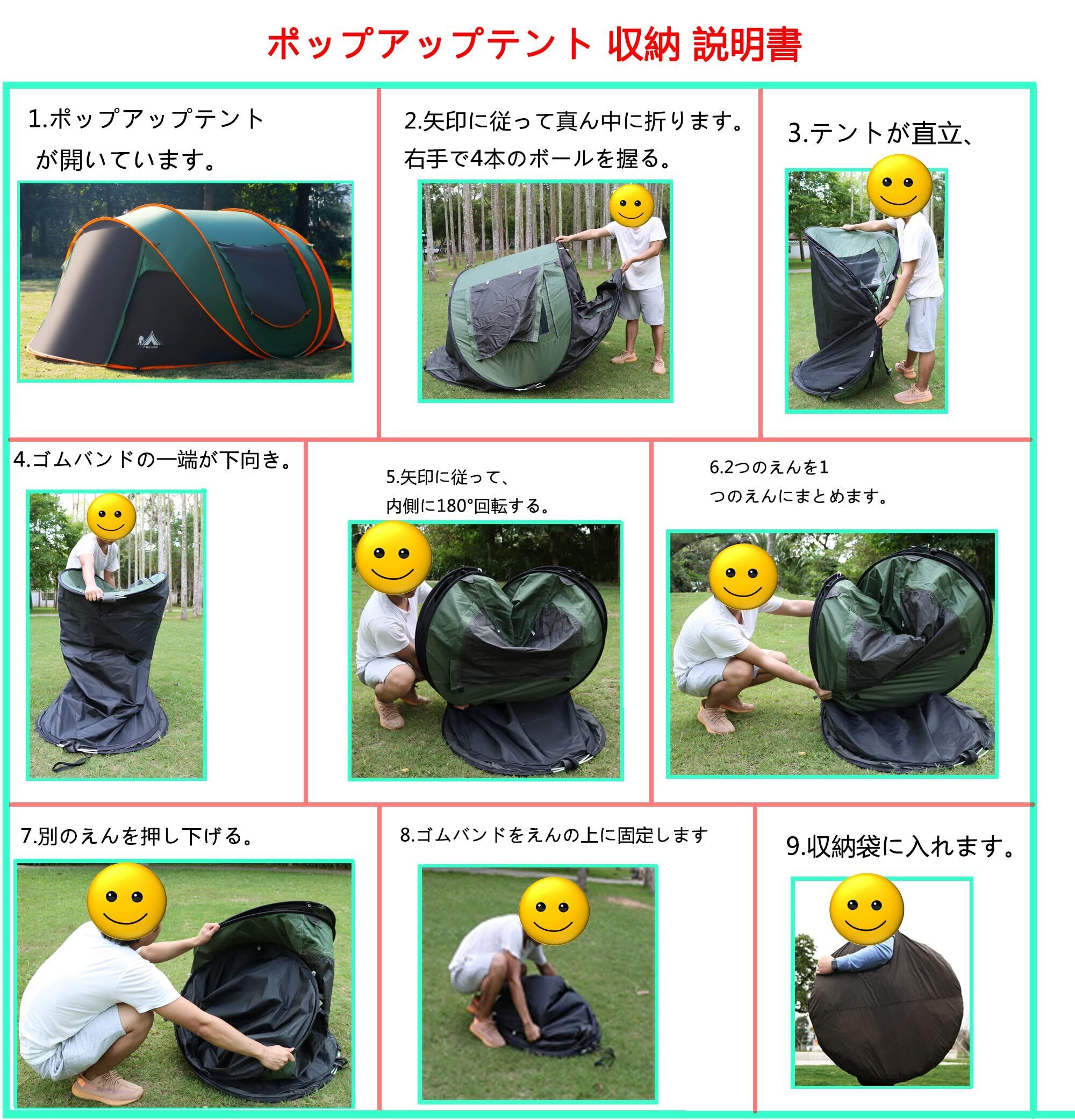 テント ポップアップテント 1秒設営 5-6人用 超軽量 折りたたみ バージョンアップ 耐水圧4000mm UVカット 紫外線防止 通気 前後ダブルドア 防虫対策(メッシュ窓付き) 日陰濃い アウトドア 花見 海水浴 キャンプ用品 災害 専用収納袋付属 日本語の説明2.8 x 2 x 1.2高さ m