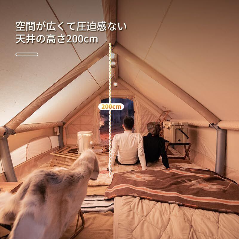 【簡単設営エアーフレーム】エアーチューブに空気を入れるだけで、テントが瞬時に立ち上がります。付属の空気入れを使い、気圧6~8PSIで空気を入れると、女性一人でも約10分で設営が完了します。フレームを組み立てる手間がなく。家族や友人と一緒に楽しめるテント。