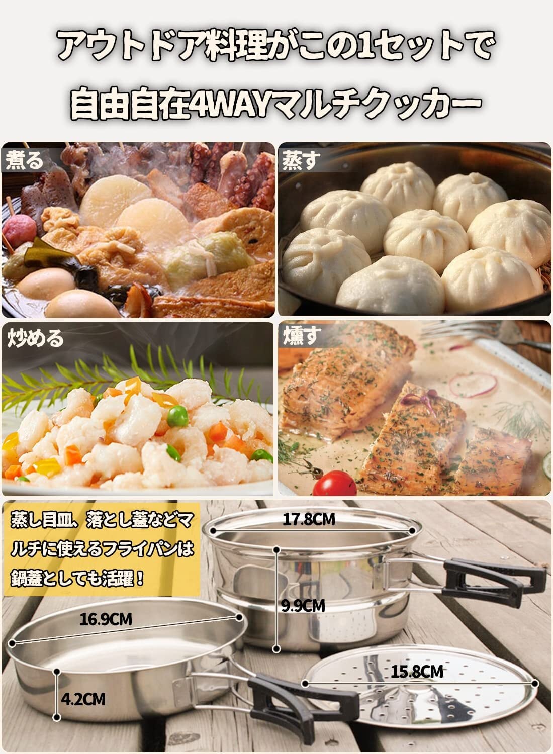 【4WAYマルチクッカー】このセットの中で、特別な4WAYマルチクッカーが付いてあります。煮る:深さ9.5cm、容量1550mlの鍋でしっかり煮込めます。蒸す:蒸し目皿が付属して、蒸し料理も楽々!炒める:口径16.5cmのフライパンでササッと炒め物ができます。燻す:食欲そそる香ばしい燻製もできます。