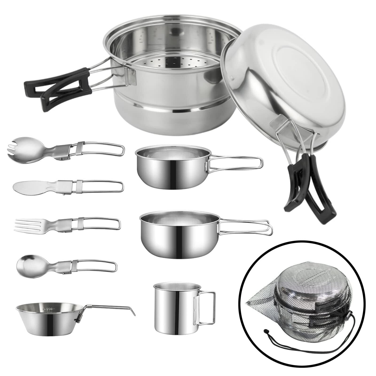 CARBABY クッカーセット 調理鍋 調理セット アウトドア鍋 食器 11点セット折り畳み式 ステンレス製 野外 BBQ 登山 花見 収納袋付き
