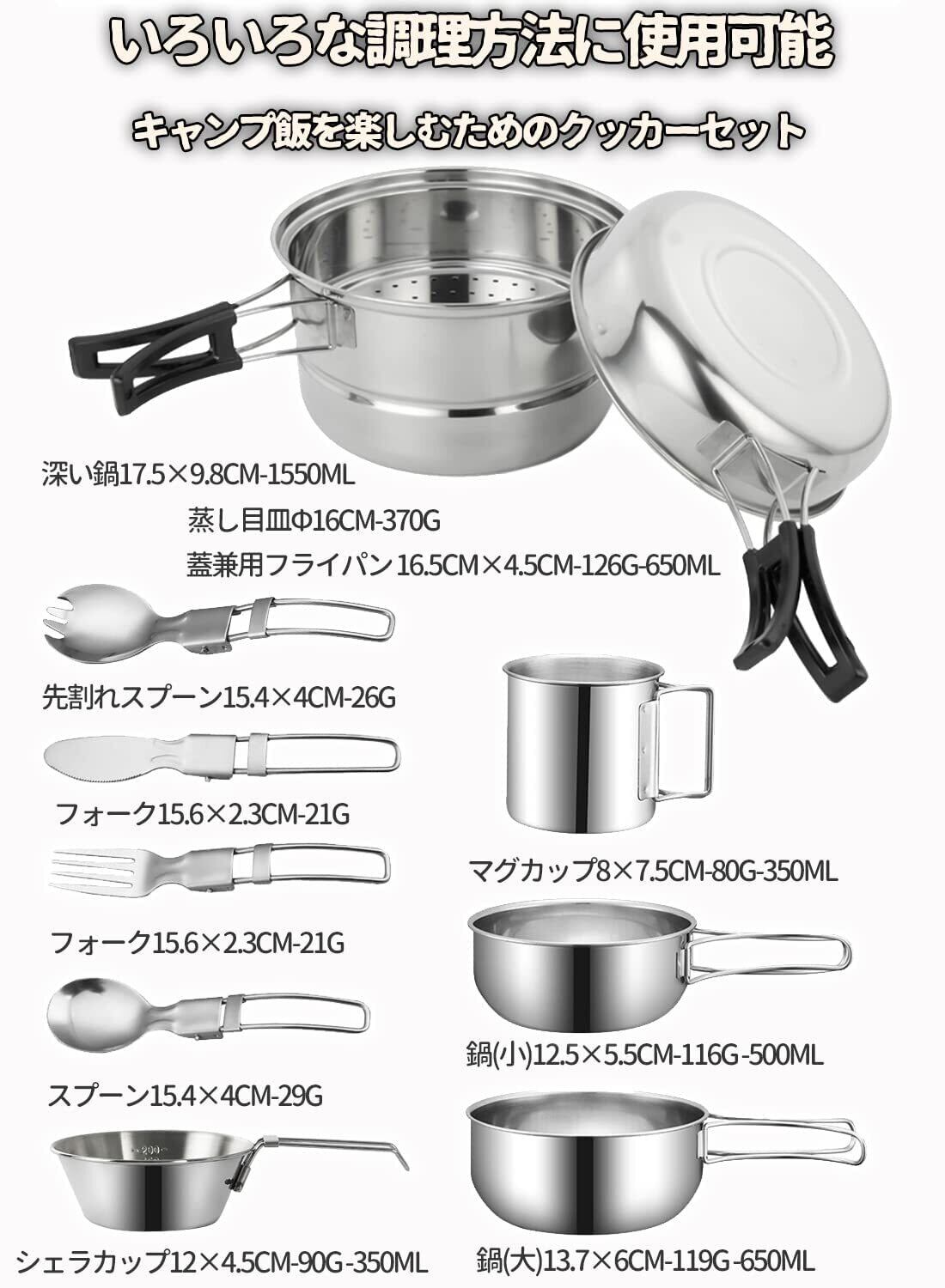【様々な用途で使用可能】本商品はストーブや直火に適応できますから、アウトドア用に適しており、キャンプ、登山、釣り、ツーリング、BBQなどに便利です。大きさも深さも違う器具が付いてあるから、様々な料理や用途に対応できます。