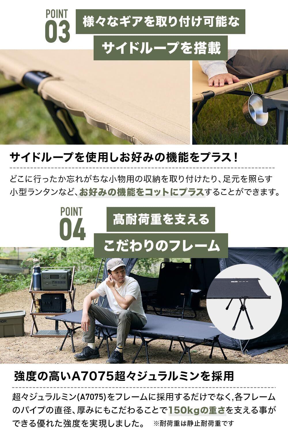 【地面からの熱や冷気をシャットダウン】- コットの下を風が通り抜けることで夏は涼しく、冬は地面からの底冷えに影響されないため快適に睡眠を取ることが可能です。コットと合わせてブランケットやシュラフ、キャンプ用マットなどを組み合わせることで、季節を問わず快適に使用することが可能に。テント内ではもちろん、シェルター内でも快適にご使用いただけます。【高耐荷重を支えるこだわりのフレーム】超々ジュラルミン(A7075)をフレームに採用するだけでなく各フレームのパイプの直径・厚みにもこだわることで150kgの重さを支える事ができる優れた強度を実現いたしました。