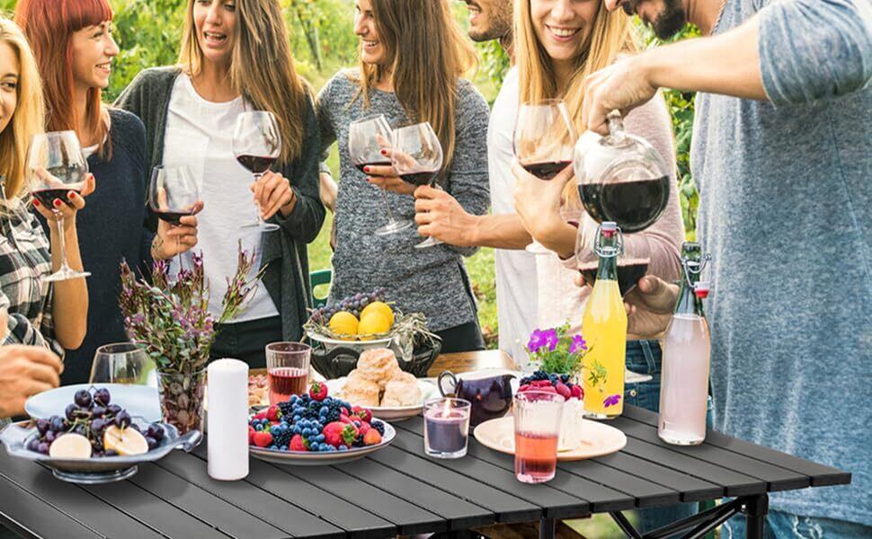 【優れた素材】高品質の材料で作られ、頑丈なフレームは、テーブルをより多くの耐荷重、安定した頑丈な、耐久性、屋外の日光に耐えることができます。テーブルトップは耐摩耗性で、油、油汚れ、汚れを優しく拭き取るだけでよく、お手入れがとても簡単です。野外活動をより楽しく便利にします。(テーブルの表面には、ホコリよけと天板保護のための保護フィルムが貼られています。必要に応じて取り外すことも、貼ったまま使用することもできます。)