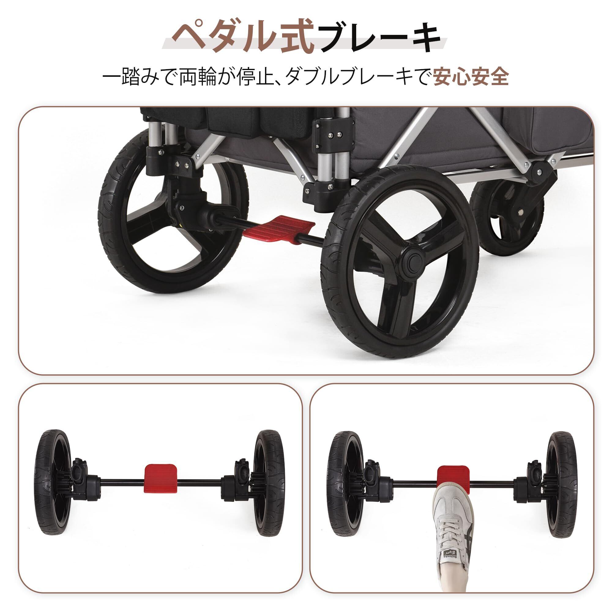 【多機能】 収納バッグ、カップホルダー、吊り下げバッグ、スマホホルダーが付いており、母子用品を運んだり、赤ちゃんがハイハイで簡単に乗り降りできます。また、ワンステップフットブレーキシステムを採用しているので、必要なときに簡単にワゴンを止めることができます。