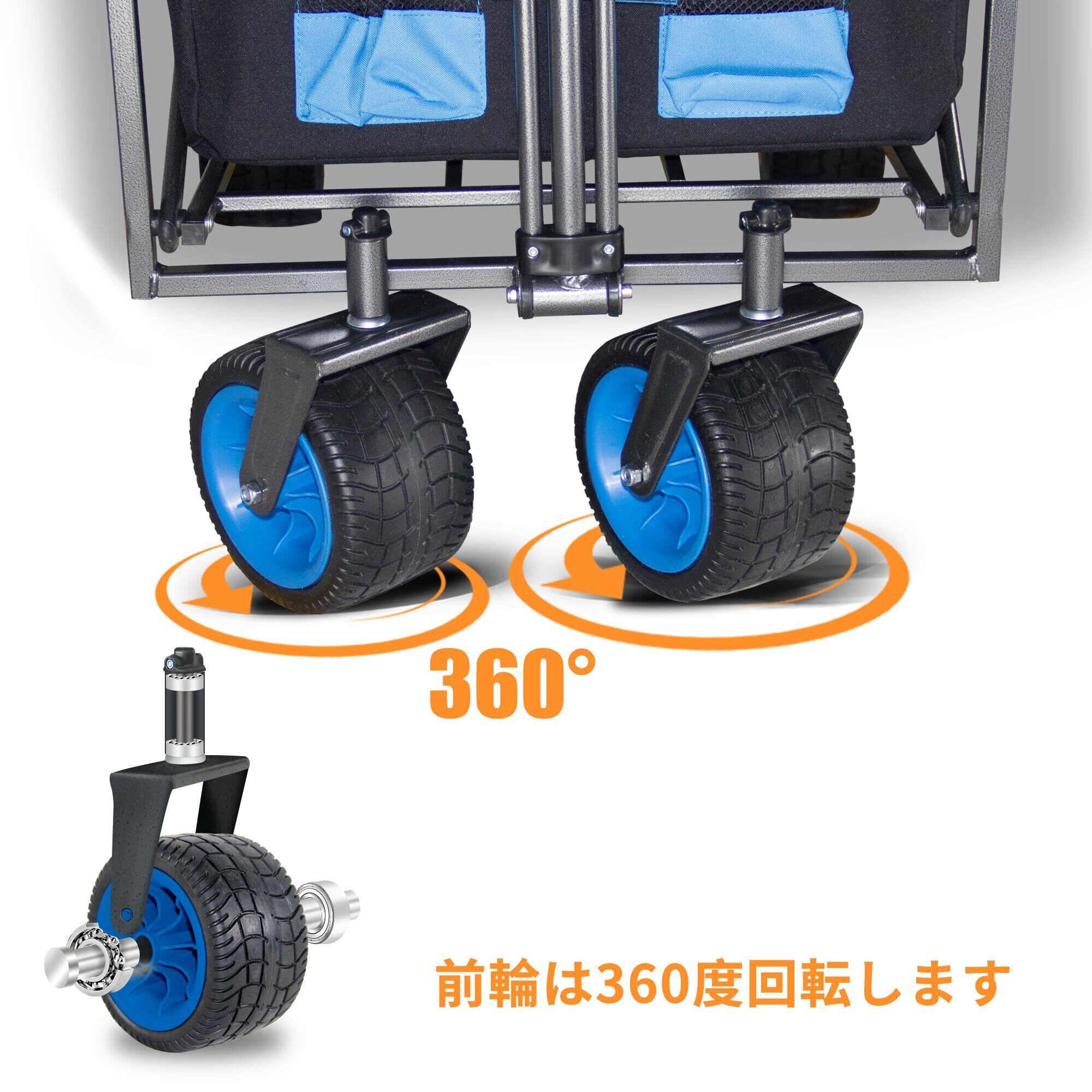 【便利と安心の設計】組み立て不要、簡単セットアップ。ワゴンの前輪は、360度回転する使用ので、ストレスなく方向転換が可能。後輪に足踏みストッパー付き、簡単にカートをその場で固定することができます。