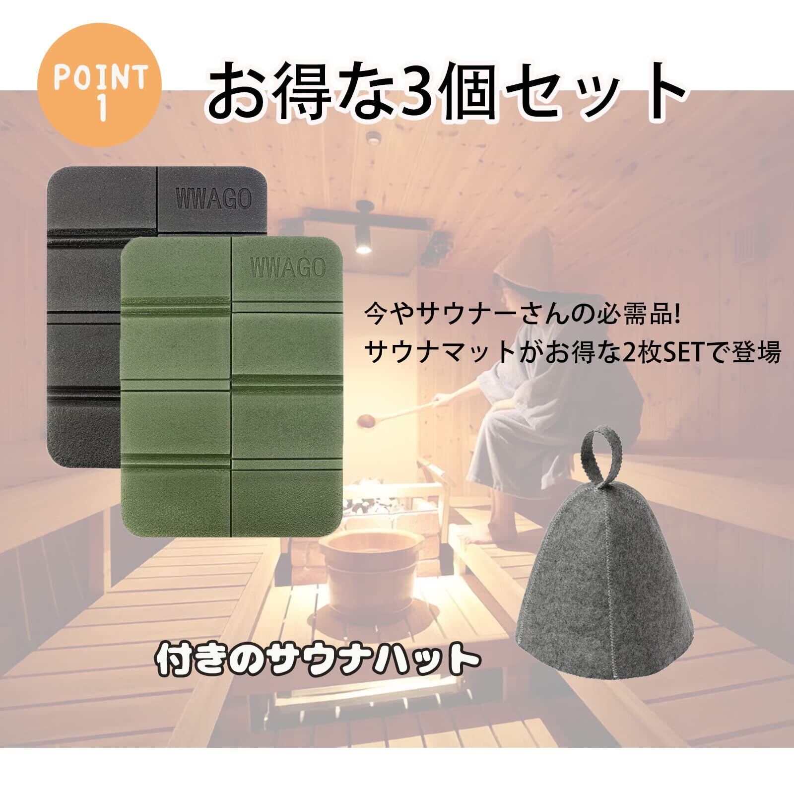 【3個セット】サウナマットは2個、サウナハットは1枚です。3個セット。サウナでかぶる帽子、いわゆるサウナハットは、日常的にサウナに入る習慣がある北欧等では、とても身近なアイテムです。元々はアウトドア用に作られている折りたたみマットです。