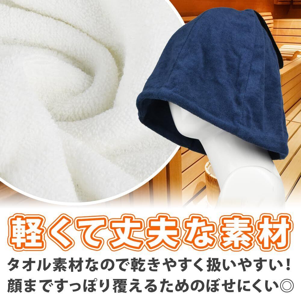 触り心地の柔らかいタオル生地を使用したサウナハットは、顔まですっぽり覆えるため男女兼用でお使いいただけます。頭部には幅広のループ付きで、未使用時はフックに掛けて保管可能です。