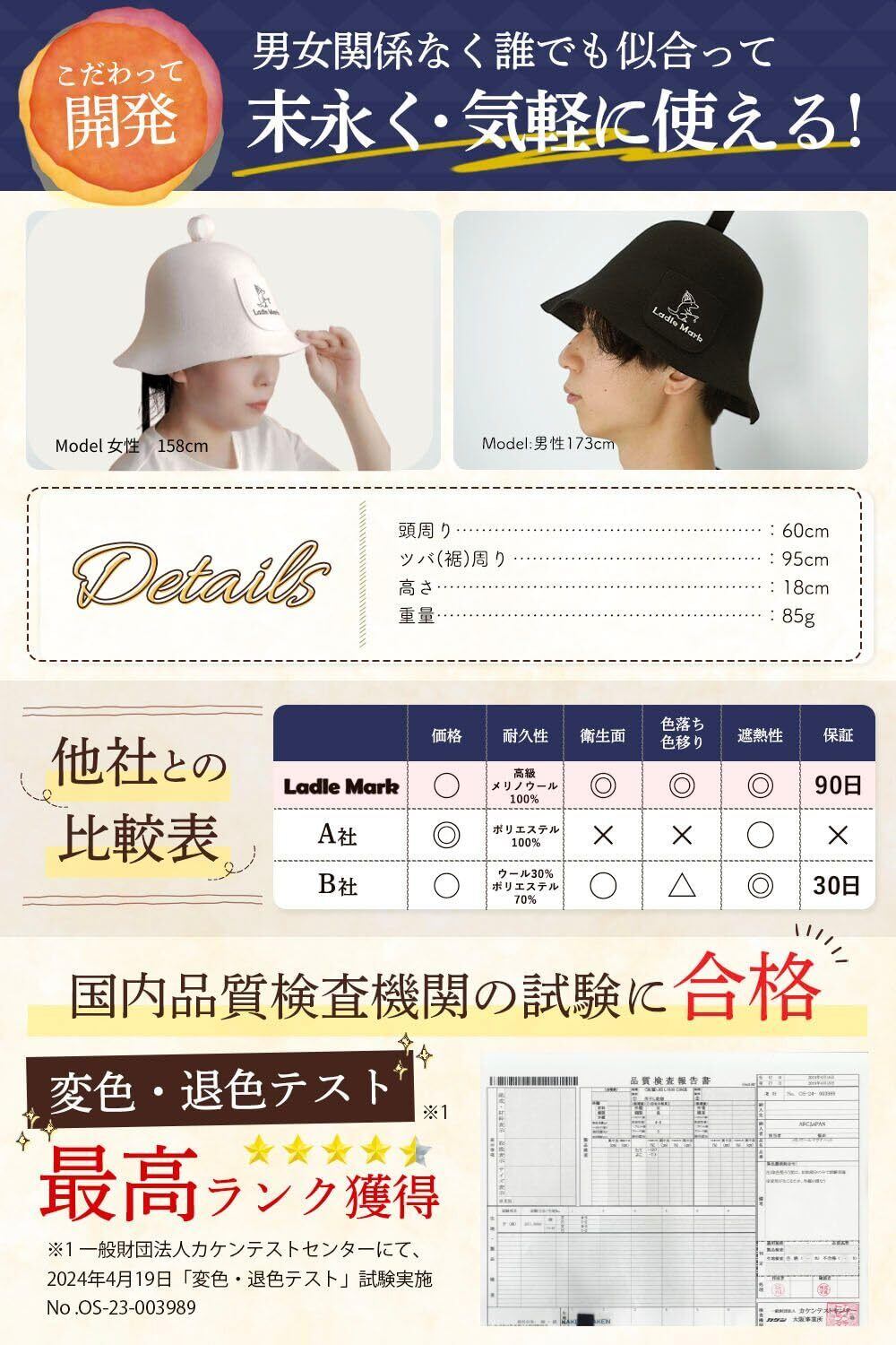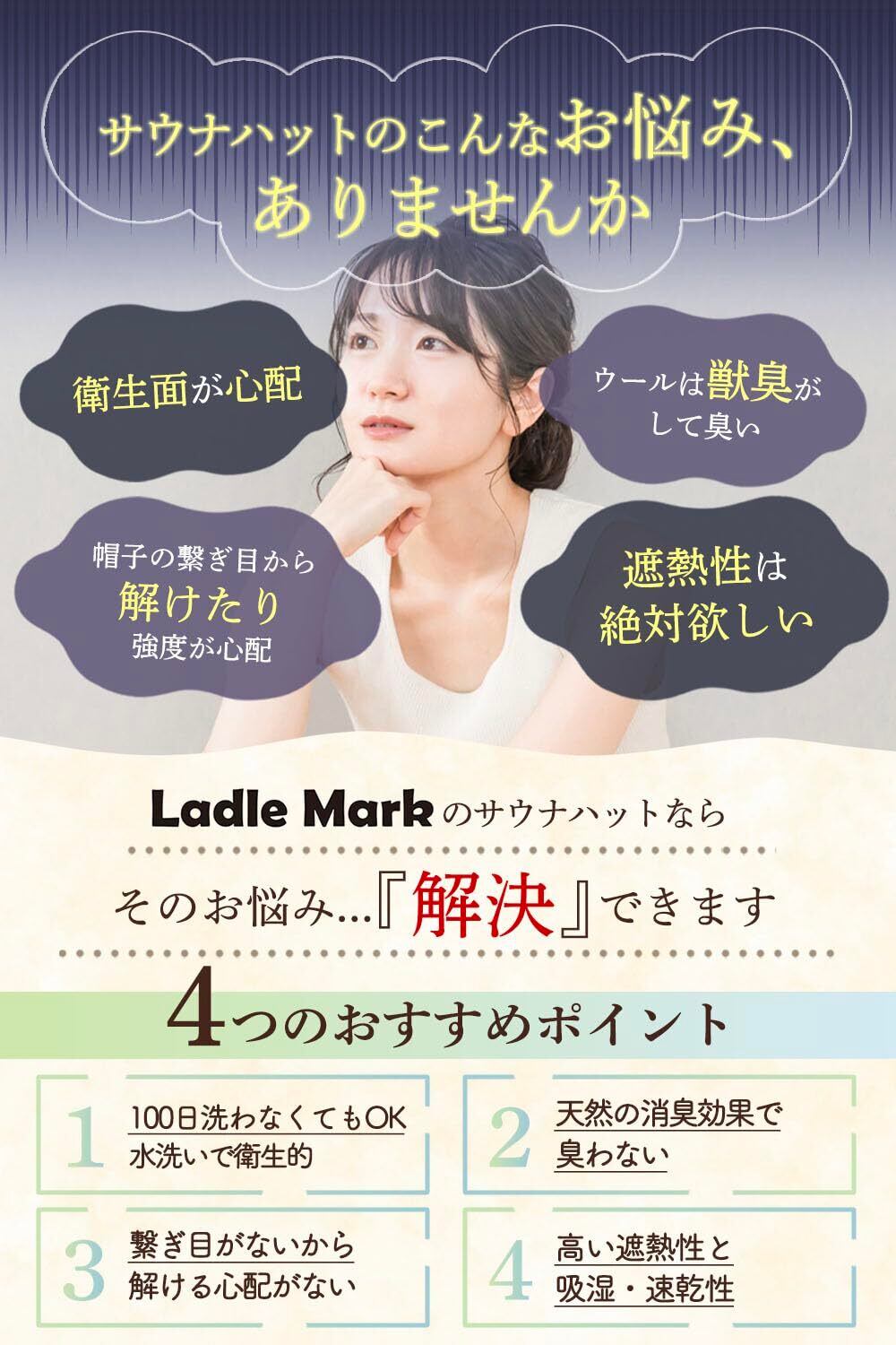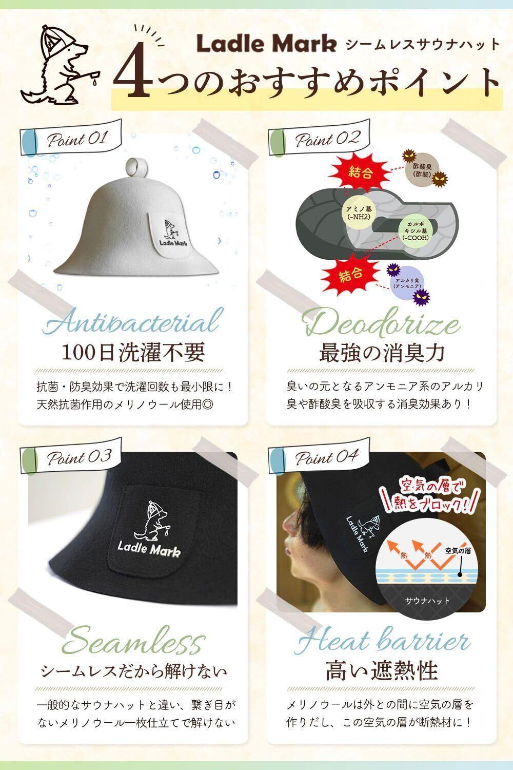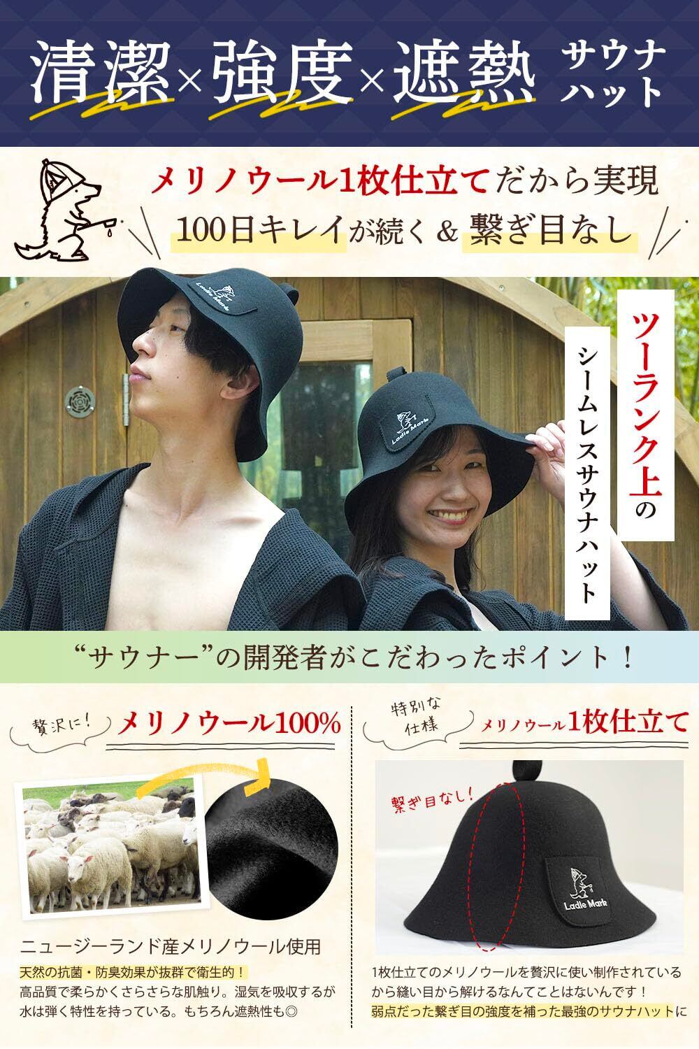 [Ladle Mark] YouTuber監修 サウナハット ニュージーランド産 メリノウール 100% シームレス 清潔 抗菌 消臭 防臭 遮熱性 ユニセックス (ラドルマーク) 白 ホワイト 黒 ブラック 羊毛