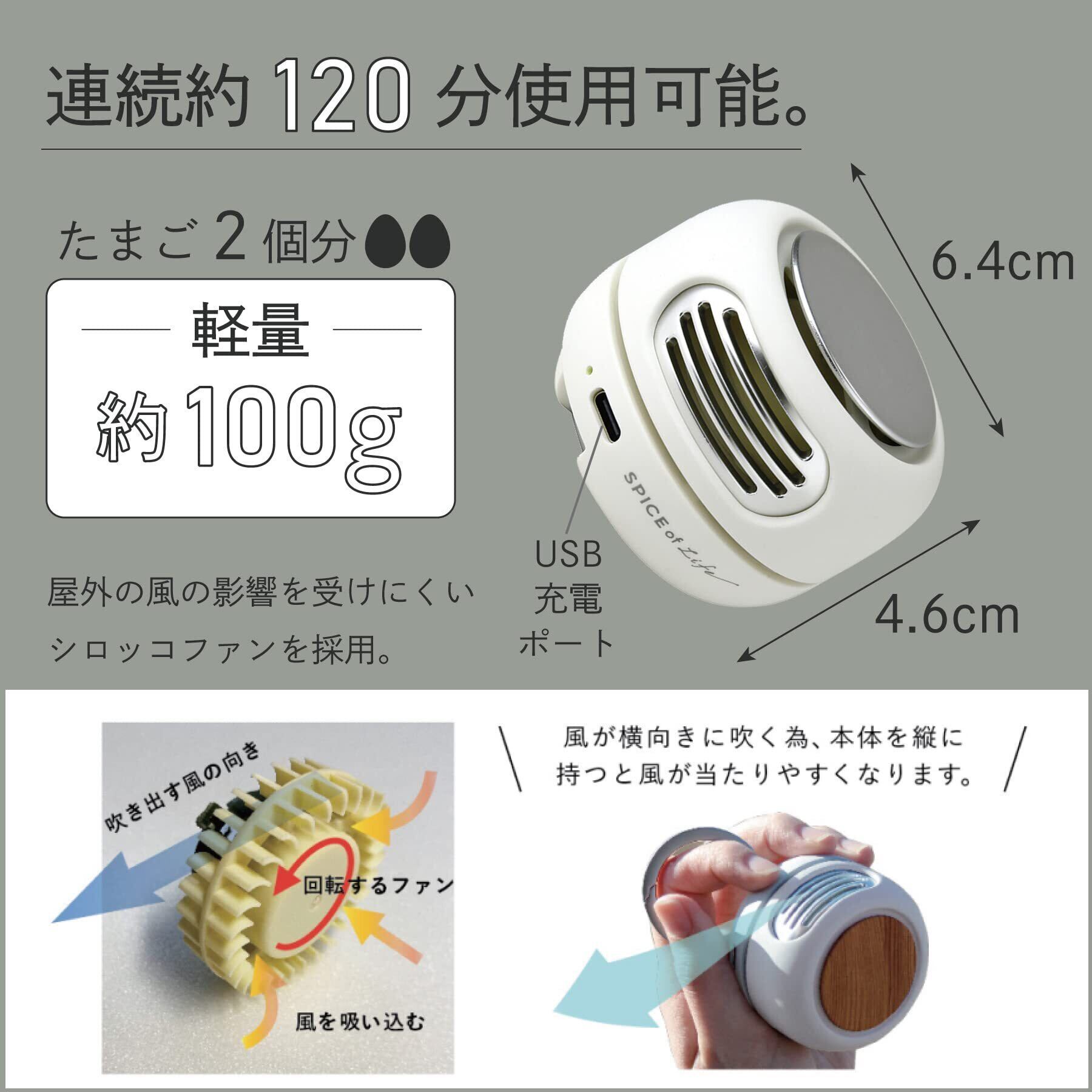 シックなマットカラーでオフの日はもちろん、ビジネスシーンでも使いやすいスタイリッシュさがあります。風量は1段階のみですが、屋外の風の影響を受けにくいシロッコファンを採用しているので、空気を送り出す力は強く静かです。リチウムポリマー電池内蔵。簡単で便利なUSB充電式(Type-C)なので、面倒な電池交換は不要です。充電時間は約150分。フル充電で、最大約120分連続使用ができます。※充電池の容量が30%以下になると、LEDライトがピンクに点滅します。