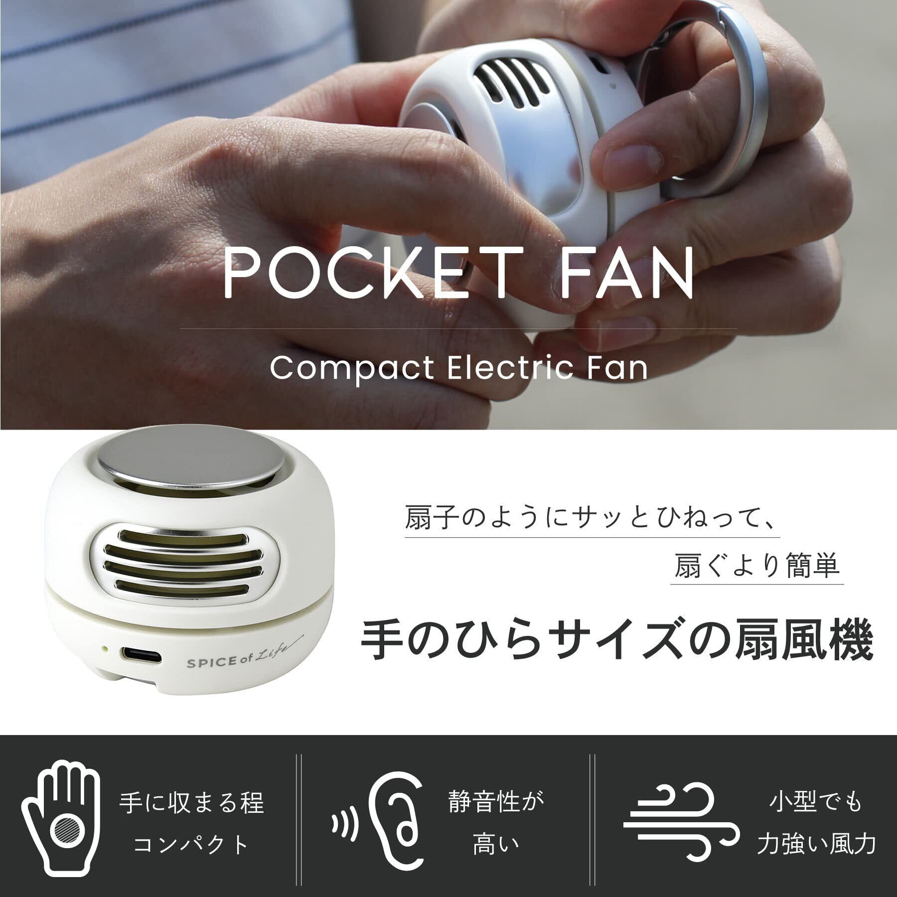 SPICE OF LIFE(スパイス) 小型扇風機 ポケットファン オフホワイト シロッコファン カラビナ付き ミニ扇風機 DFHD232OW