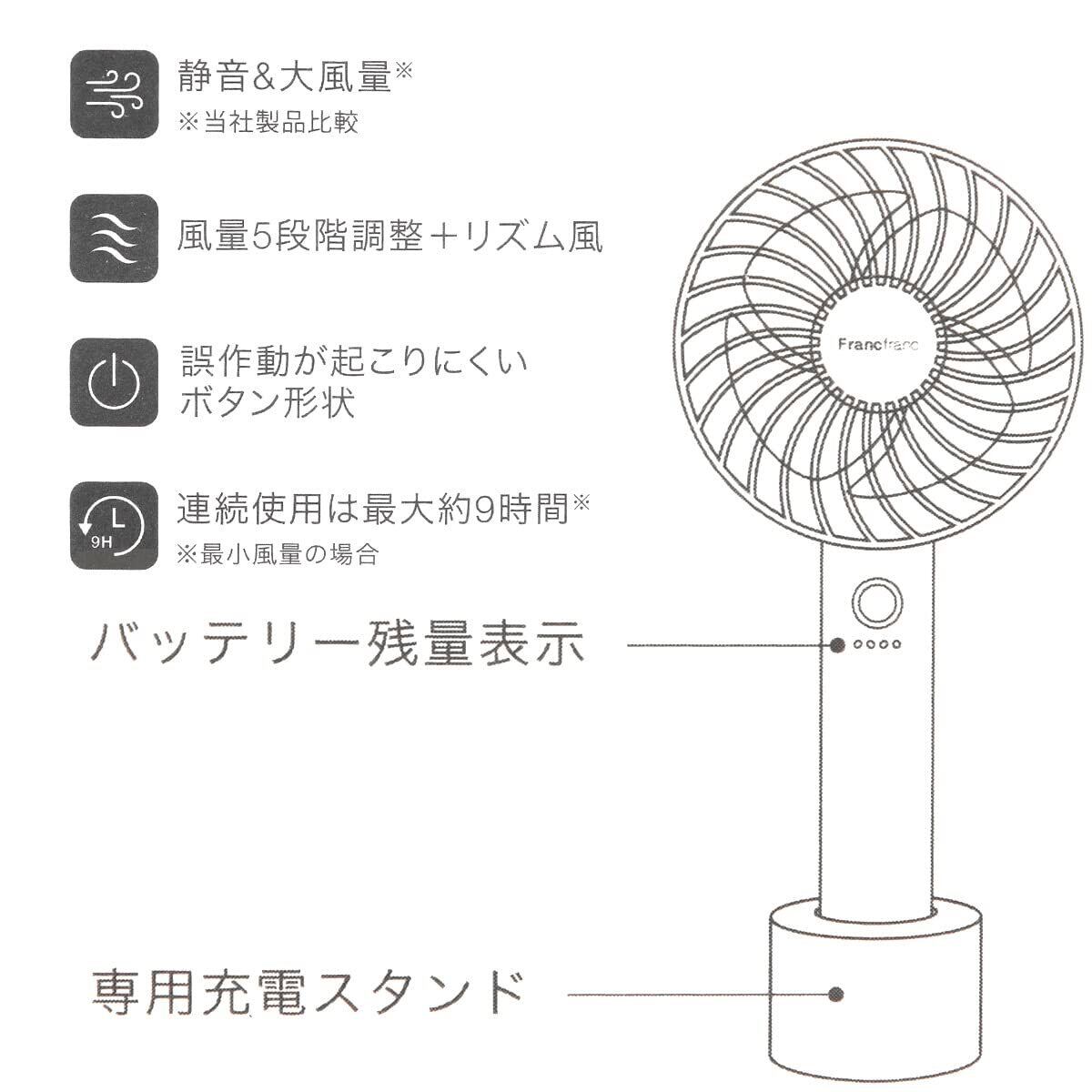 夏の定番「フレハンディファン」 卓上でも携帯型でも使える2WAYタイプのUSB充電式ハンディファンが今年も登場! ファッションに合わせて選べる豊富なカラーバリエーションで、今年もFrancfrancが「持ち歩ける涼しさ」をお届けします。 【強力な5段階の風+リズム風】 風量は弱~強モードの5段階+リズム風をボタンひとつで簡単に調節できます。 手軽な携帯型ながらしっかりと涼しさを感じられるパワフルタイプ。強力な風で熱中症対策にも効果的です。 【うれしい2電源対応】 USB電源と充電池の2電源に対応。 付属の専用充電スタンドやパソコンのUSBポートからも充電できます。充電池使用の場合は約4時間で充電完了。 風力「最大」で約2時間、「微弱」ならたっぷり9時間の連続運転が可能です。 【「涼しい」を持ち運ぶ】 便利なコードレスタイプだからいつでもどこでも使い方自由自在です。 フェス、イベント、スポーツ観戦、通勤・通学時など様々なシーンで活躍します。持ち運びに便利なストラップ付き。 付属の専用充電スタンドを使えば手がふさがっている時も安心。 デスクや洗面所、キッチンなど、お好きな場所にさっと移動してスモールペースを涼やかに心地よくキープできます。