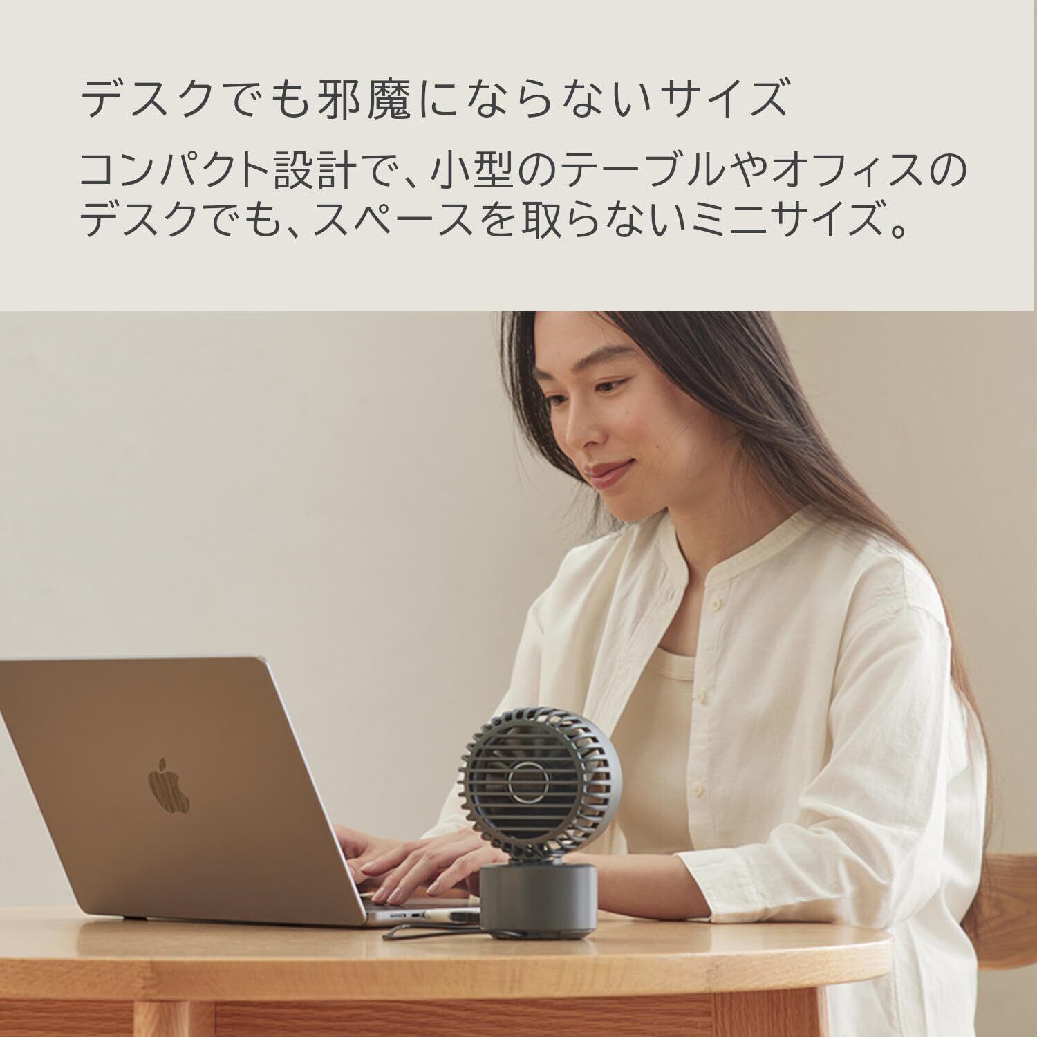 【心地よい風を生み出す左右自動首振り】左右自動首振りを採用することで、デスクトップでの風の心地よさを追求しました。風の当たる範囲を広げることで、効率よく体の熱を冷まし、直風による乾燥防止にも役立ちます。