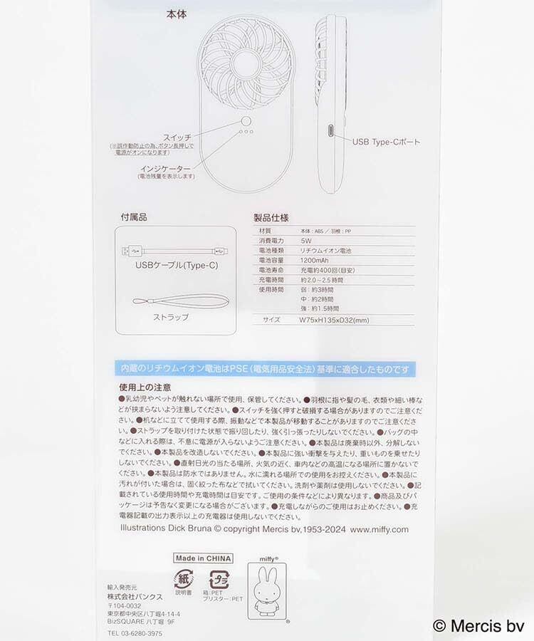 2WAY仕様のミッフィーマルチハンディファン。 5段階で角度調整が出来るハンドル、風量は3段階で調節が可能。 USB充電式で、最大約6時間の連続使用が出来ます。 手持ちではもちろんストラップで首に掛けたり、スタンド付きなのでデスク周りでも大活躍◎。 ※充電中はランプが赤色に点灯します。充電が完了してLEDライトが消灯したら、ケーブルを外してください。 ※本品に付いているご注意書きをお読みの上ご使用ください。