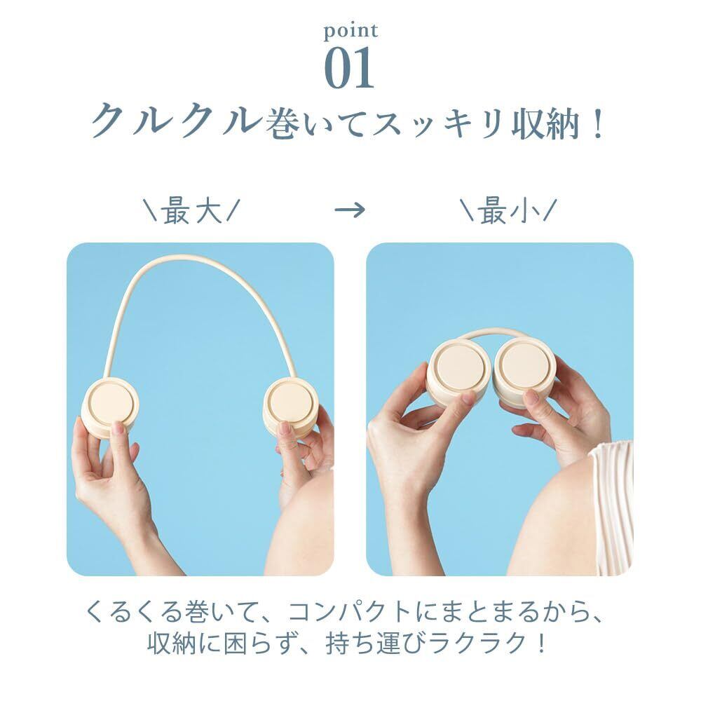 くるくる巻いてコンパクトに収納できるネックファン。収納ポーチ付きでお出かけにも便利