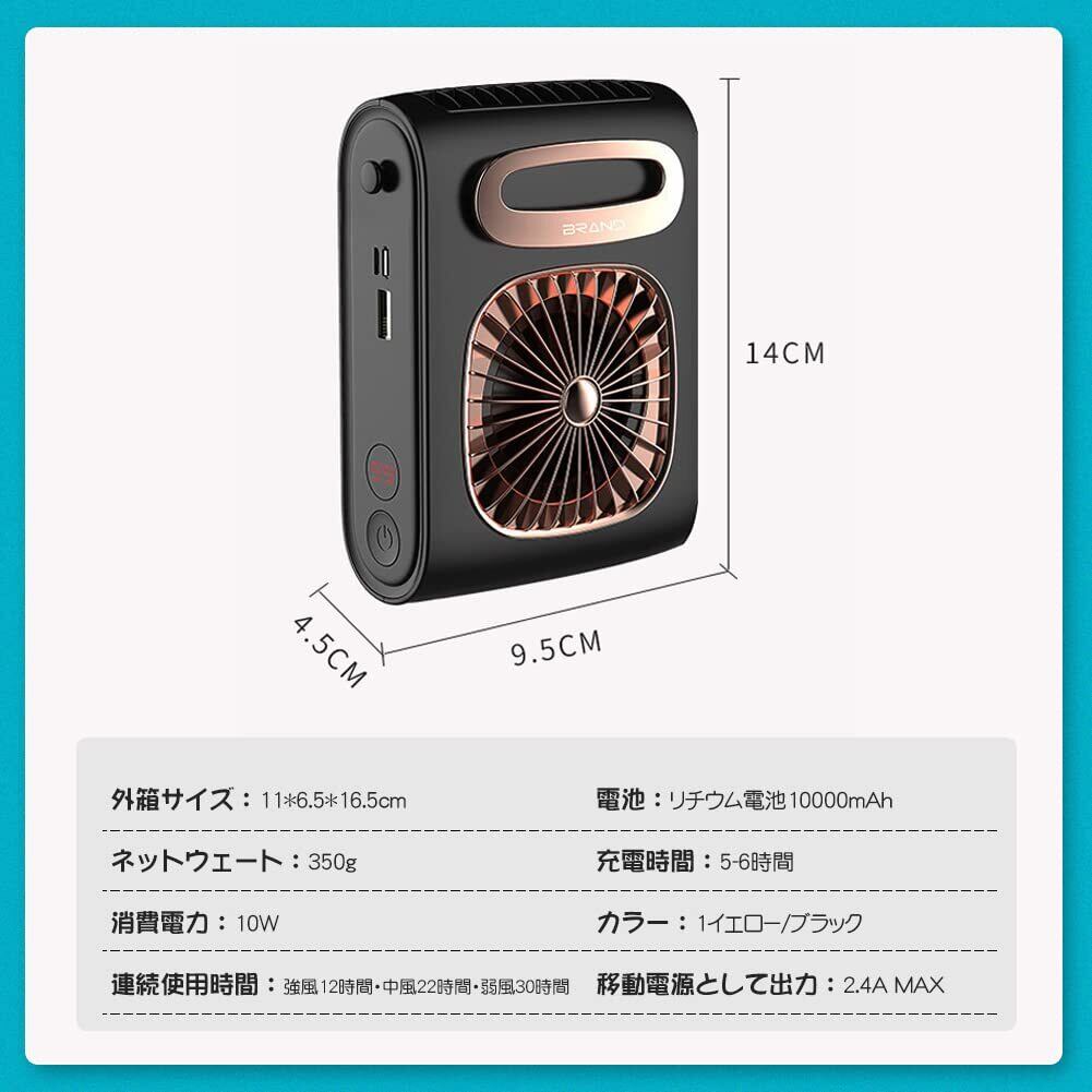 USB充電方式:10000mAhの大容量電池を内蔵し、パソコン、移動電源、スマホ充電器(5V/2A)などで簡単に充電ができます。約5-6Hの充電で最小風量モードでは約30時間の連続使用、最大風量モードでも約12時間の連続使用が可能です