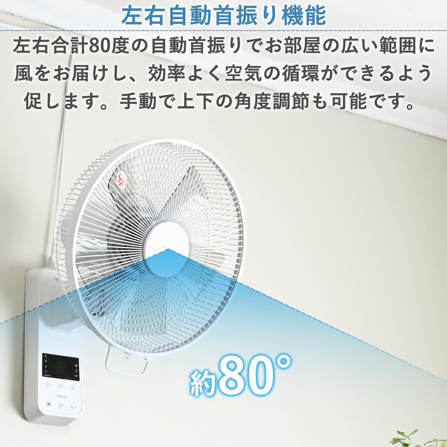 ●左右合計80度の自動首振りでお部屋の広い範囲に風をお届けし、効率よく空気の循環ができるよう促す。