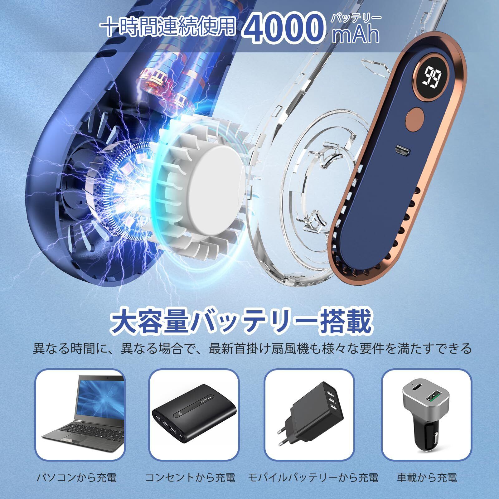 【4000mAh大容量】携帯扇風機は超大容量の4000mah電池を搭載しており、どこでも持ち運び便利て、どこでも使用できます。