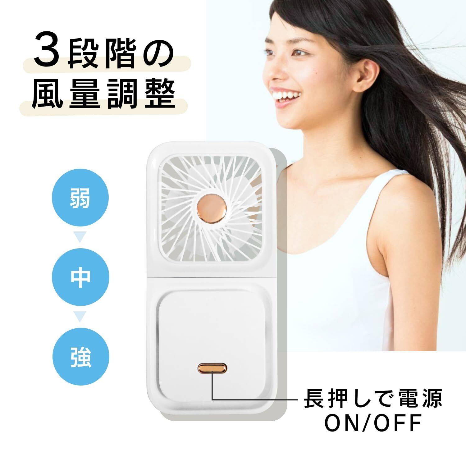 【3way】 外出時、室内時など様々なシーンで使える便利なハンディファン。サッと取り出して使える「ハンディ」、付属のストラップを付けてハンズフリーで使える「首掛け」、スマホを置いて使える「卓上扇風機」の3つの方法で使えます。