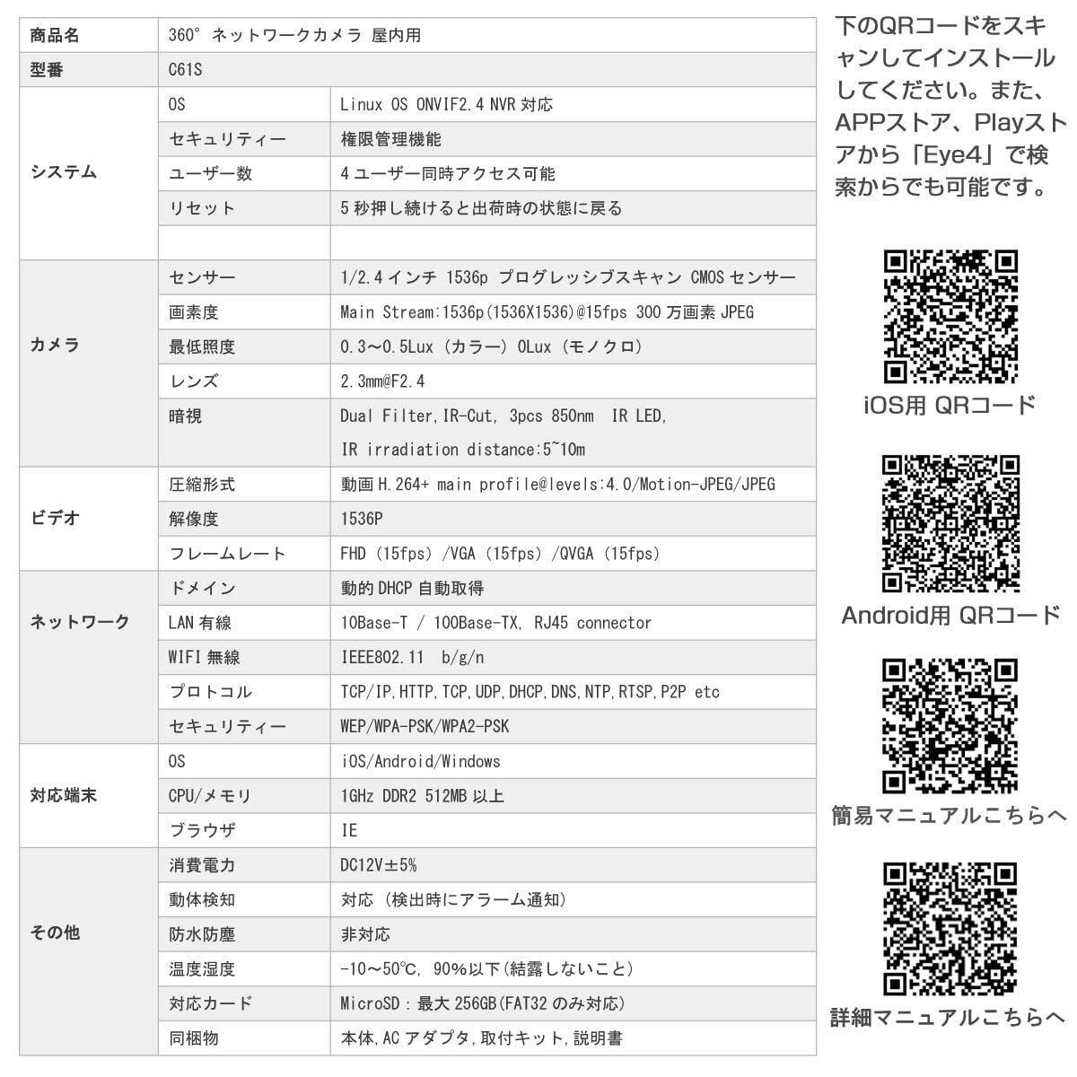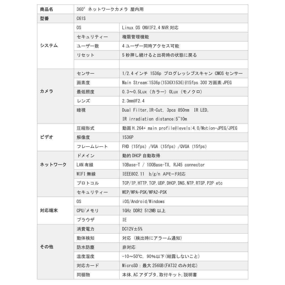 「C61S.A」防犯カメラ 屋内用 300万画素 ONVIF対応 ネットワークカメラ 魚眼レンズ 360度 全天球 FHD 1536P WIFI 無線 MicroSDカード録画 PSE 技適