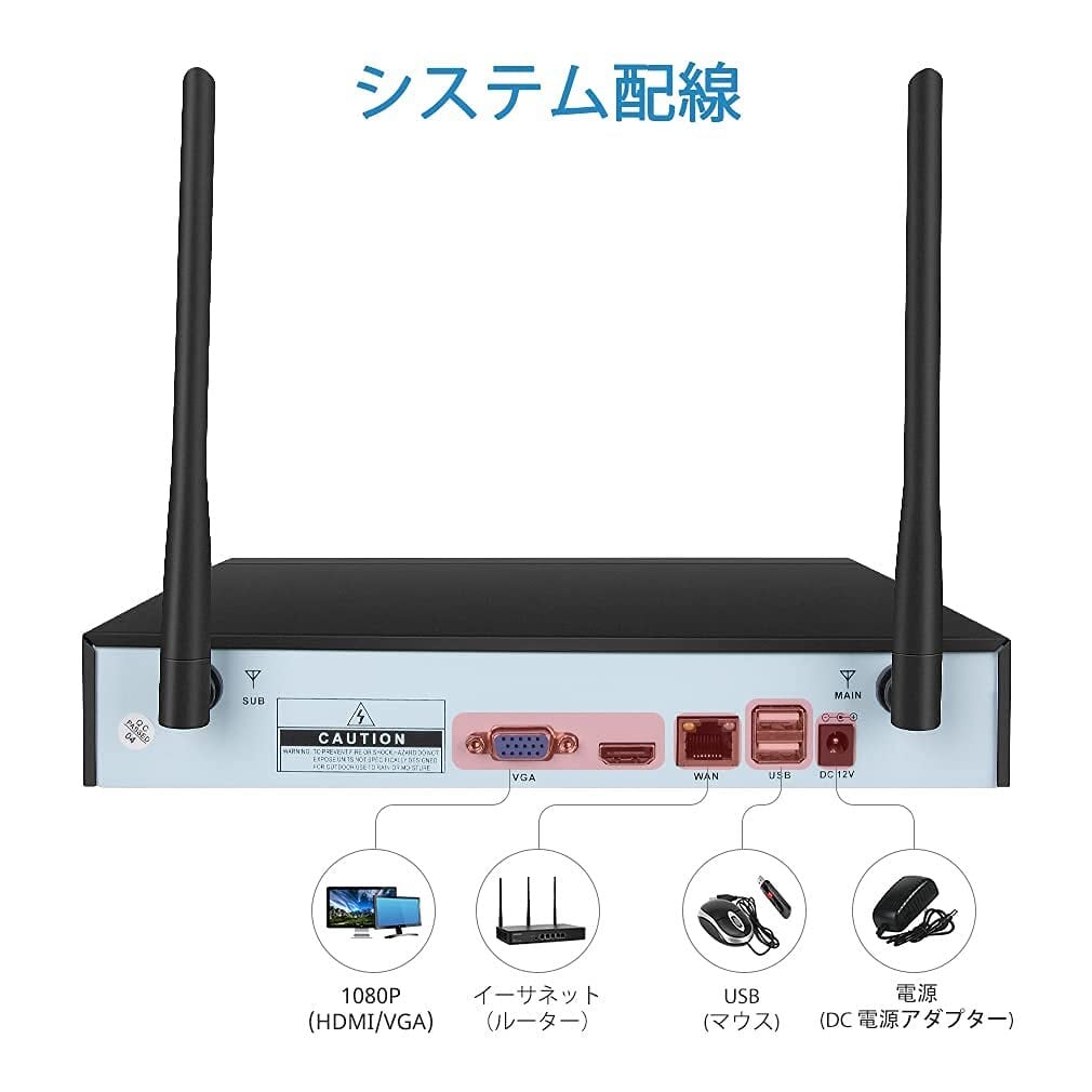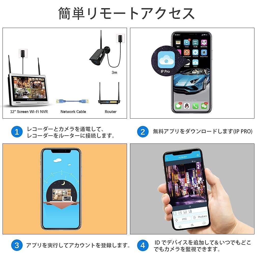 【ワイヤレス接続・操作簡単】 ワイヤレス防犯カメラなので、設置簡単、配線工事が不要です。IPカメラとレコーダーに電源を入れると、自動にコードをマッチングし、ローカル観覧する場合、インタネット要らず監視や再生が可能です。遠隔観覧する場合、LANケーブルでNVRとホームルータを接続する必要です。